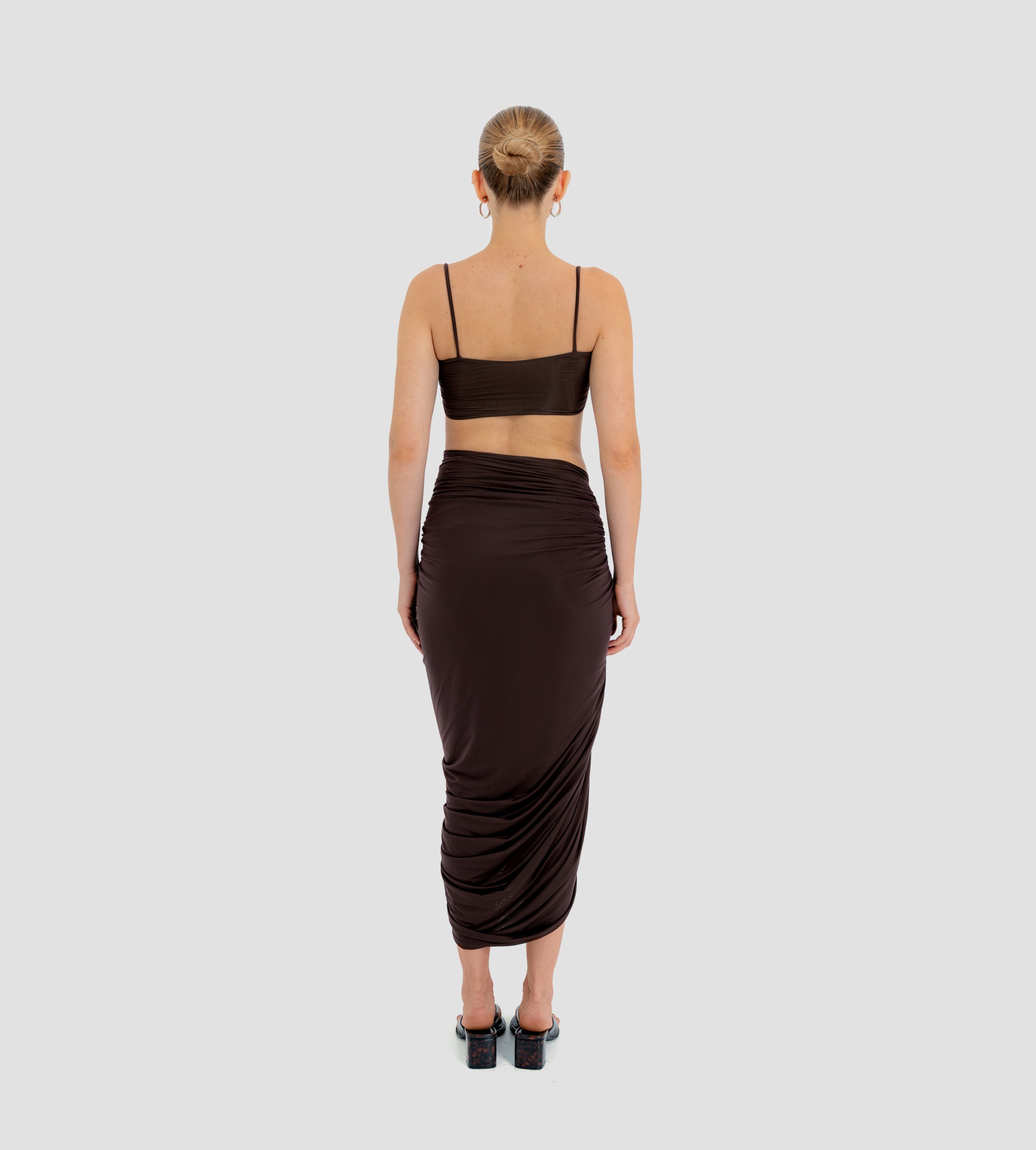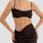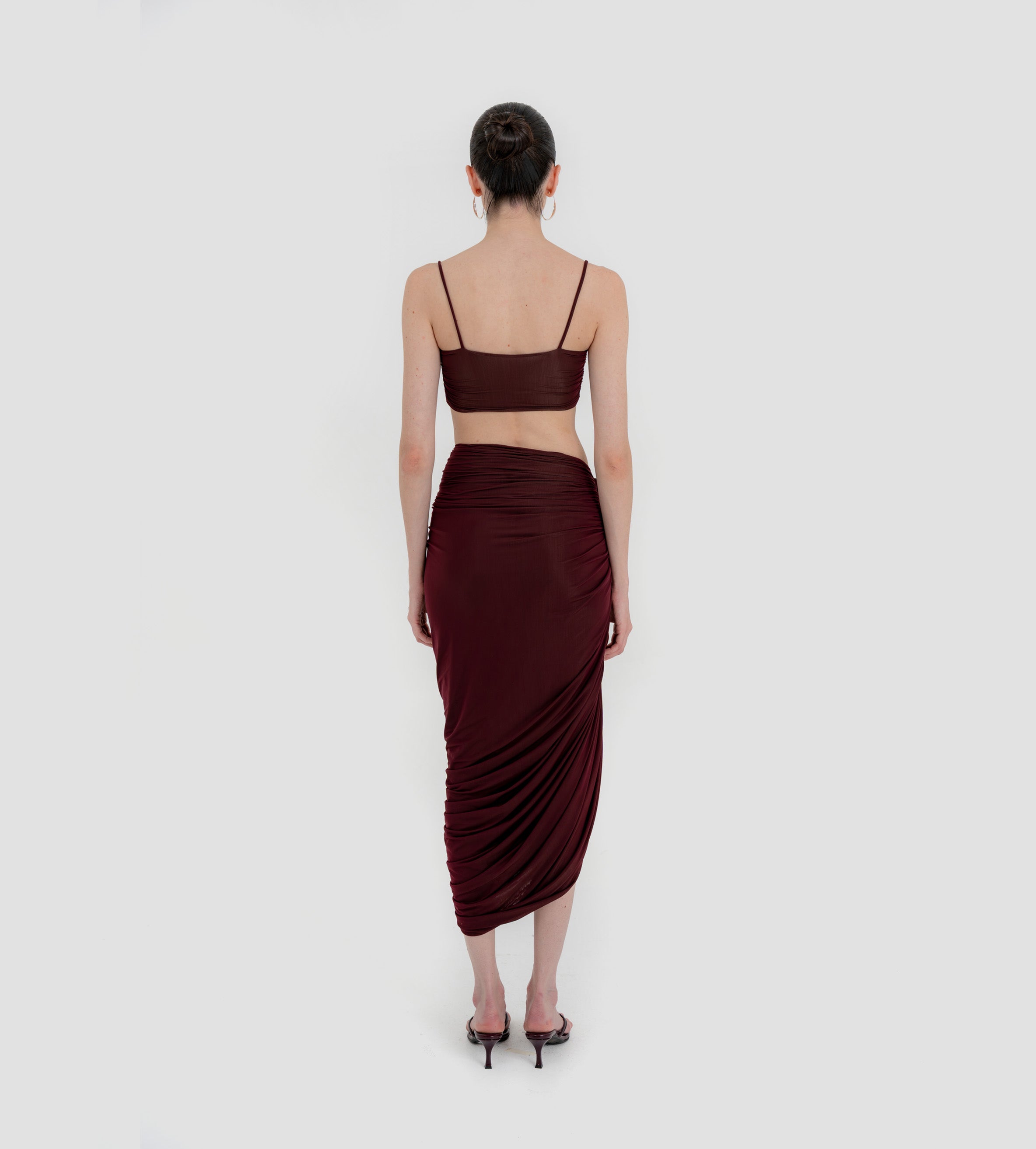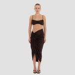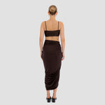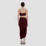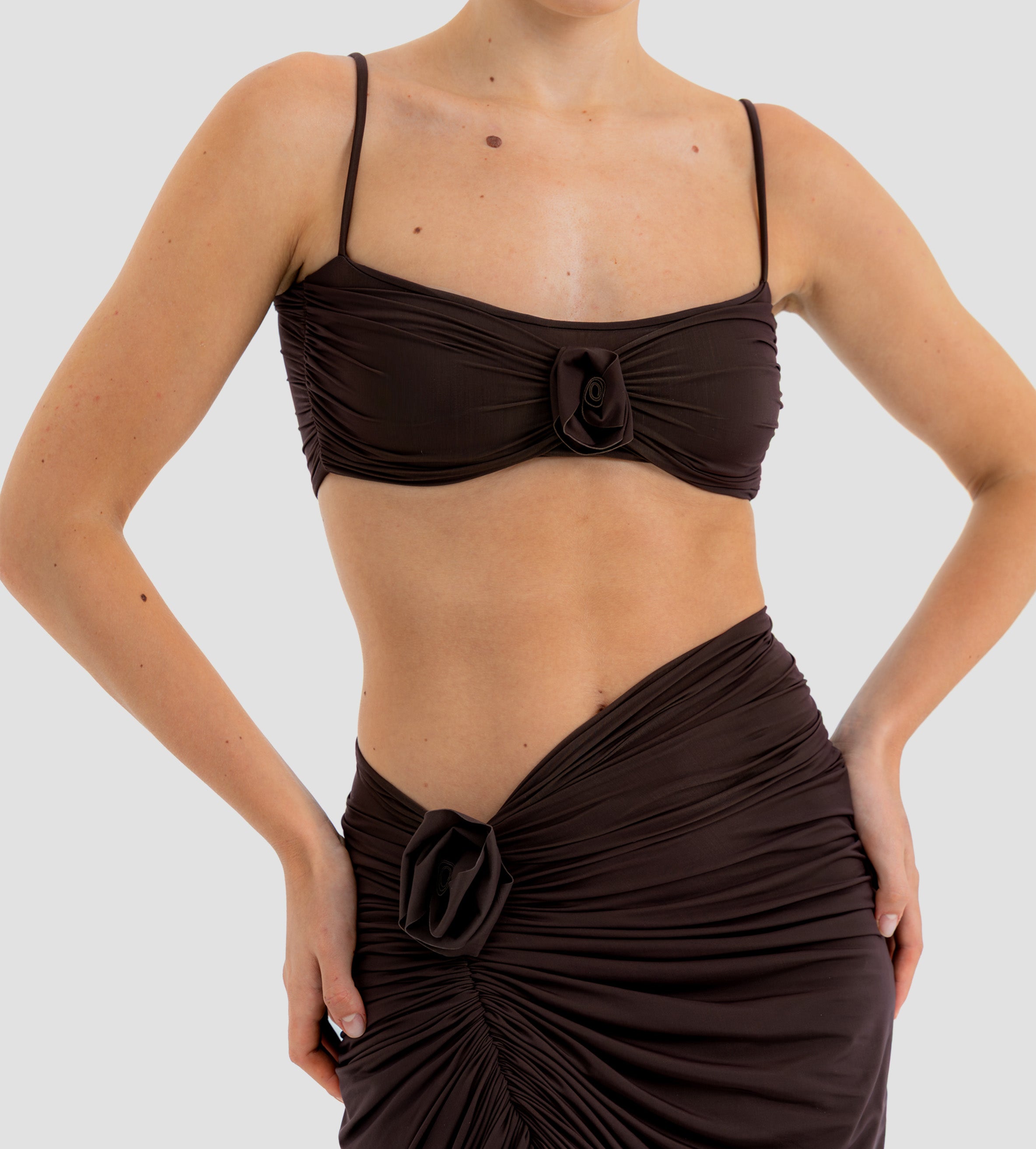Nuestro set Medusa destaca un top de escote recto, enmarcado por delicados tirantes. El top está construido por una doble capa, la primera crea la base lisa y da el ajuste perfecto, mientras que la segunda incorpora un fruncido audaz y un detalle central de flor 3D. Se combina con una falda midi asimétrica que se recoge y cae drapeada desde el costado y se ve adornada por un detalle de flor 3D.