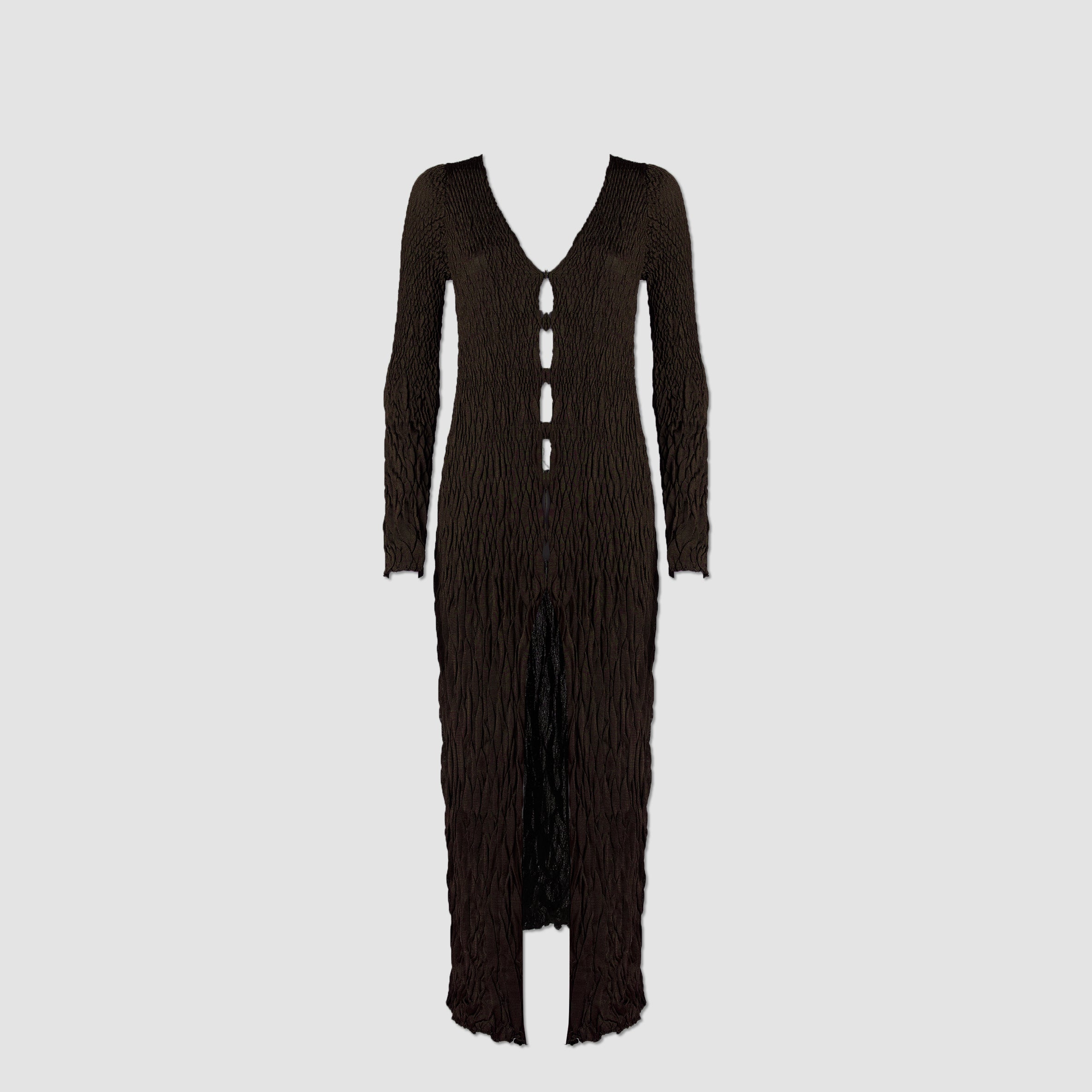 Cardigan largo, el cual presenta un escote profundo en V, mangas largas ajustadas y una abertura en la parte delantera la cual permite múltiples opciones de uso en este diseño moderno. Una nueva silueta creada en nuestra nueva tela texturizada de punto.