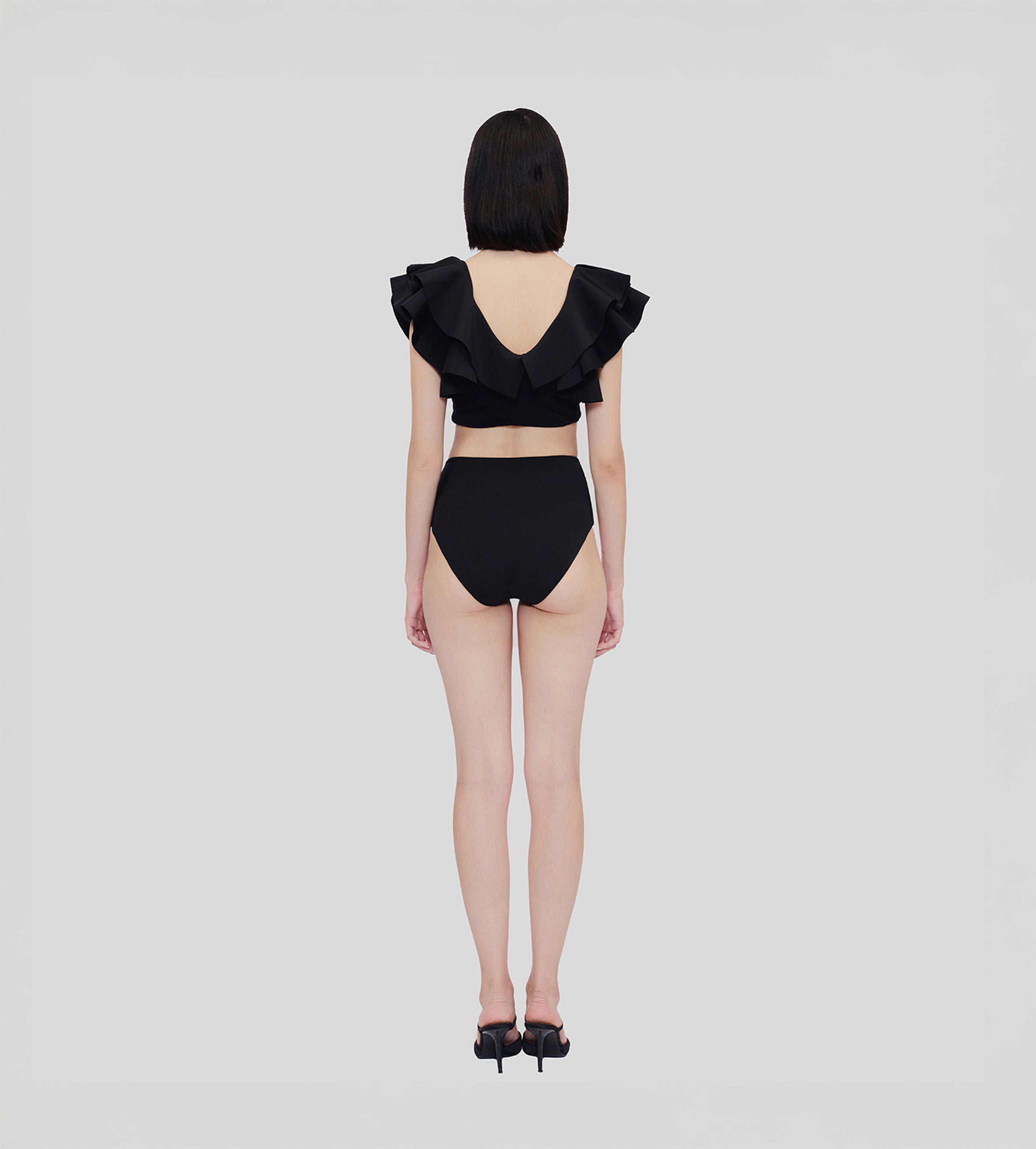 Traje de baño de dos piezas con talle alto. Parte superior con cuello triangular profundo adelante y atrás con doble arandelas desde el escote hasta la espalda cubriendo los hombros.