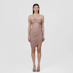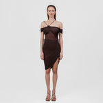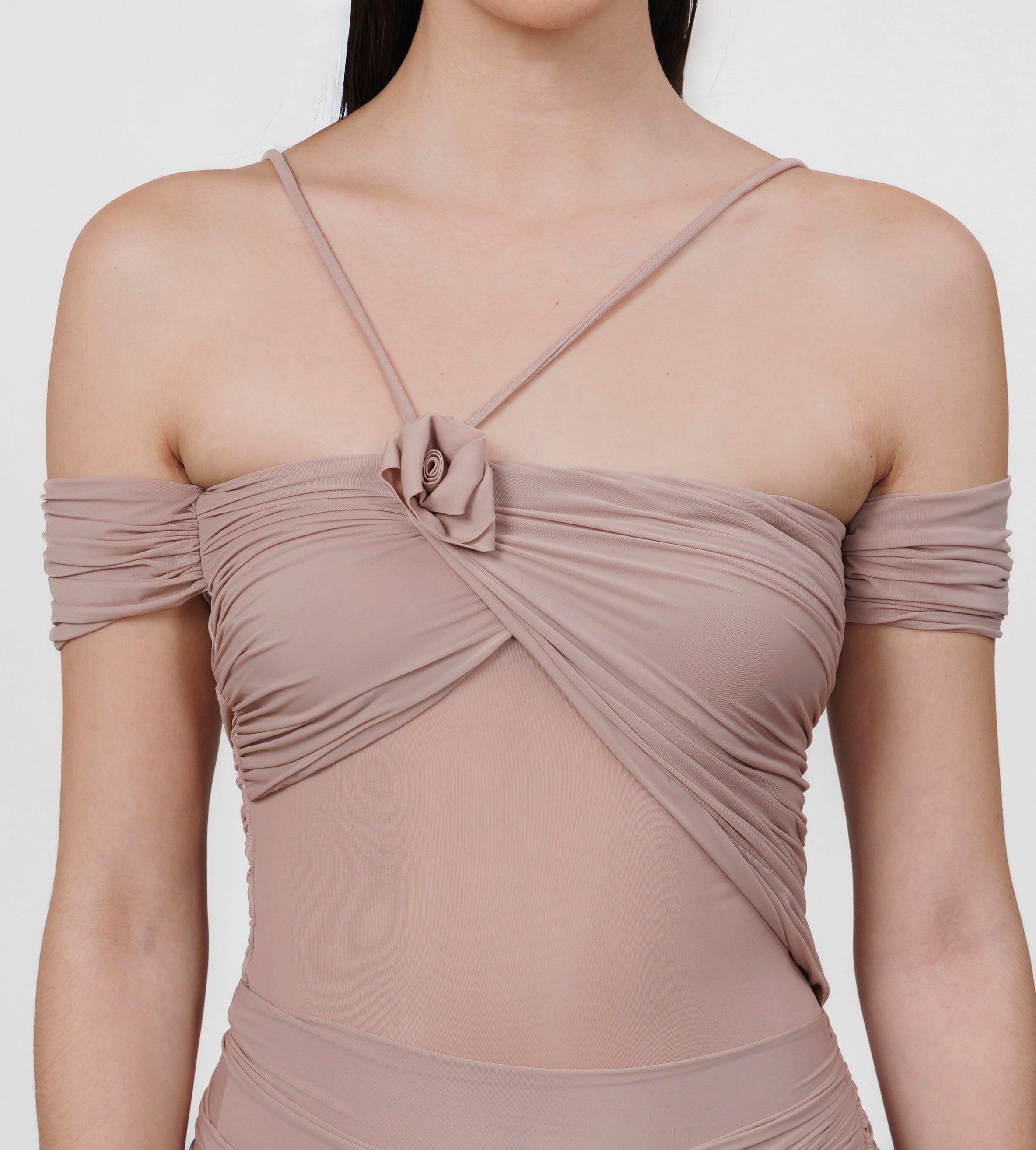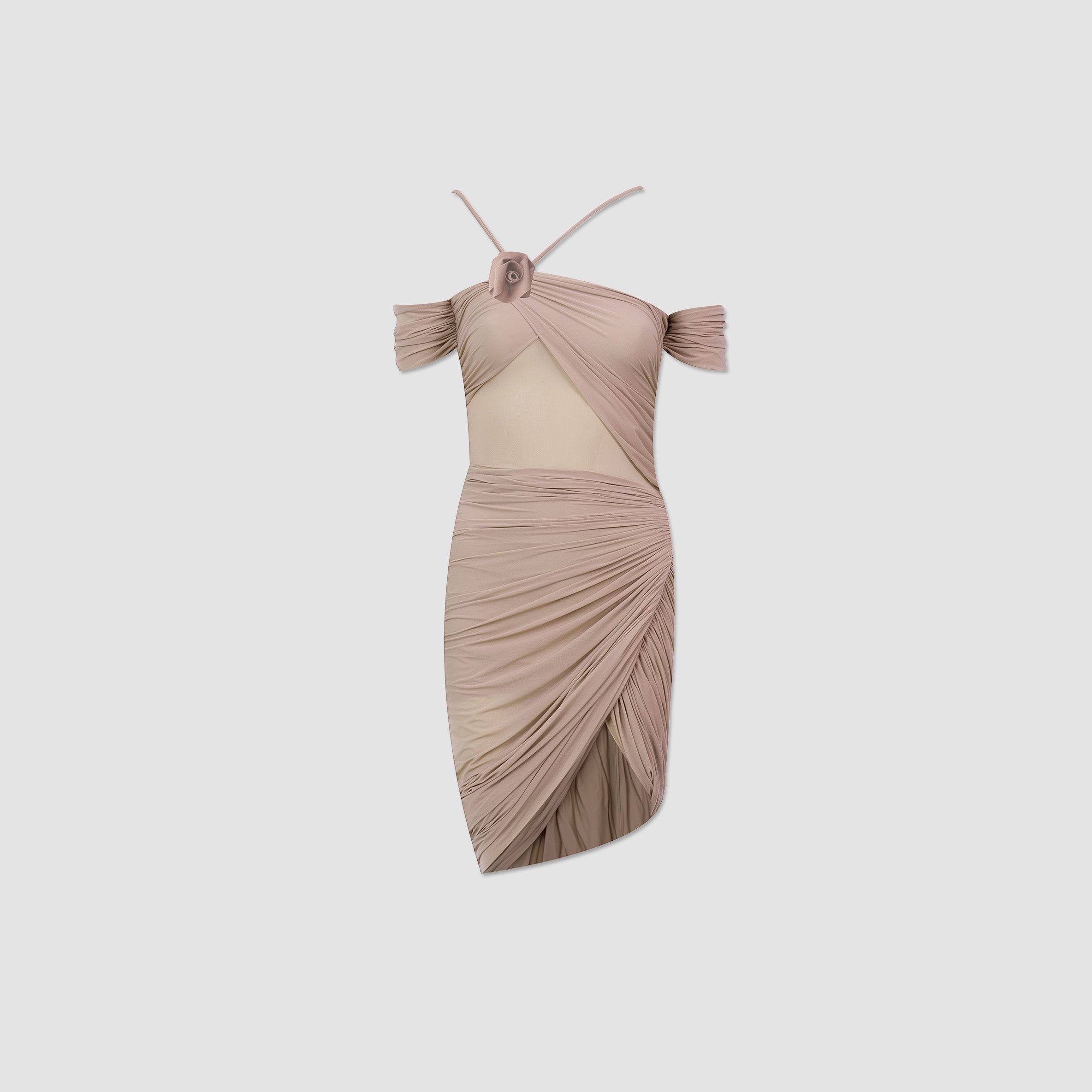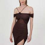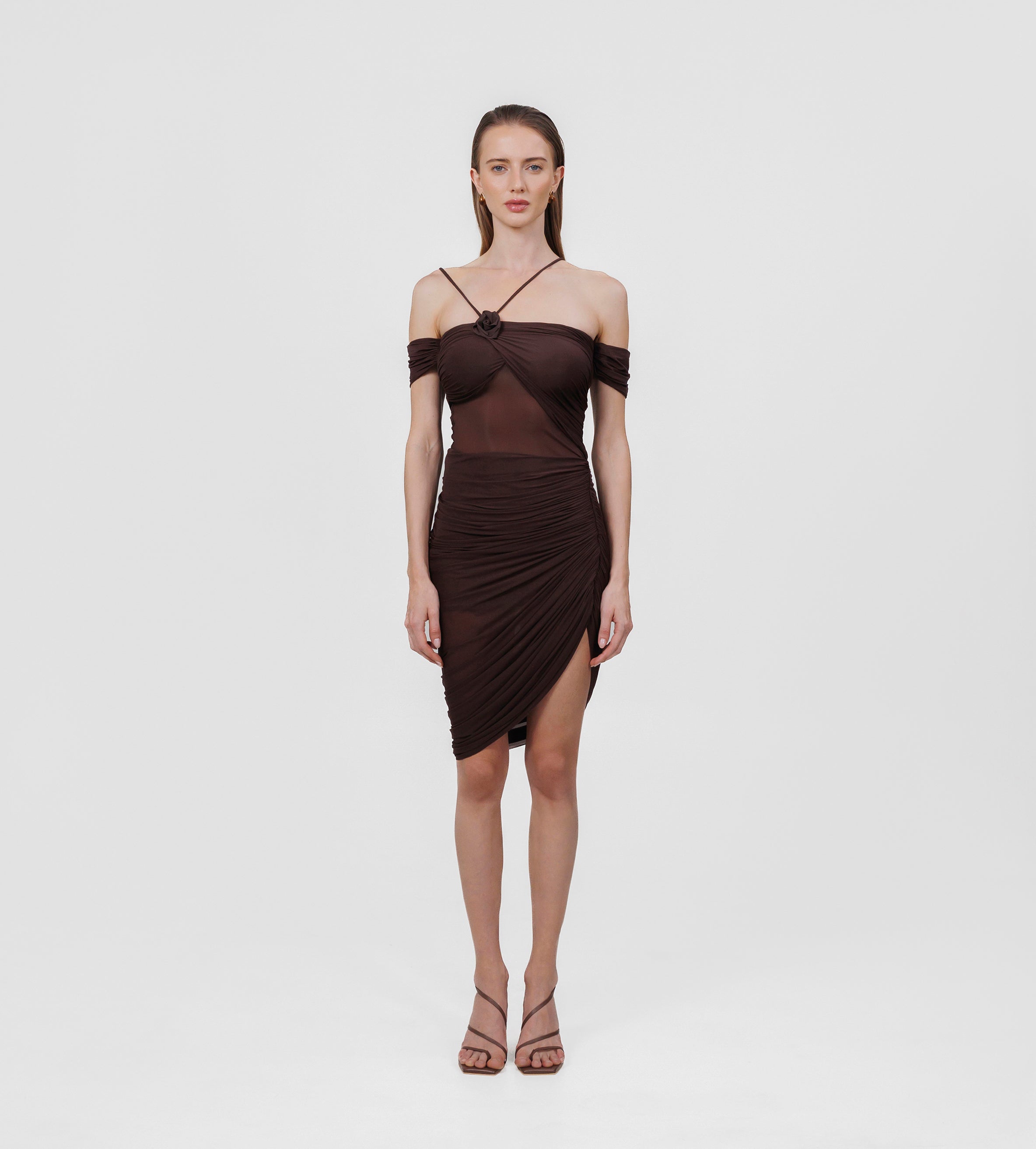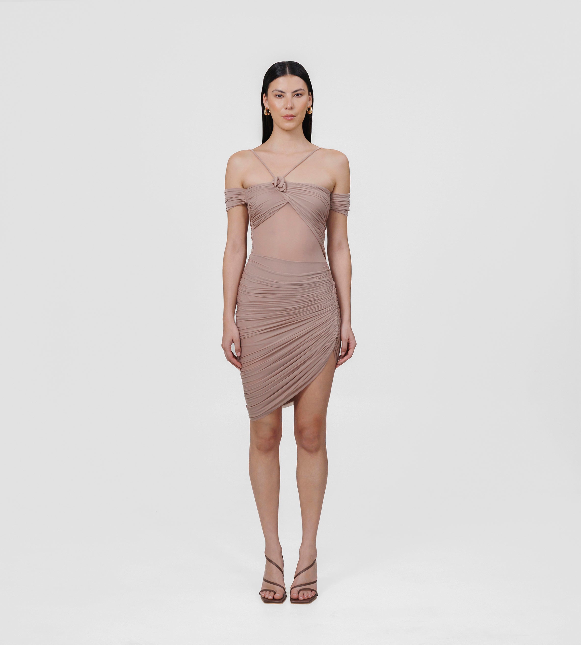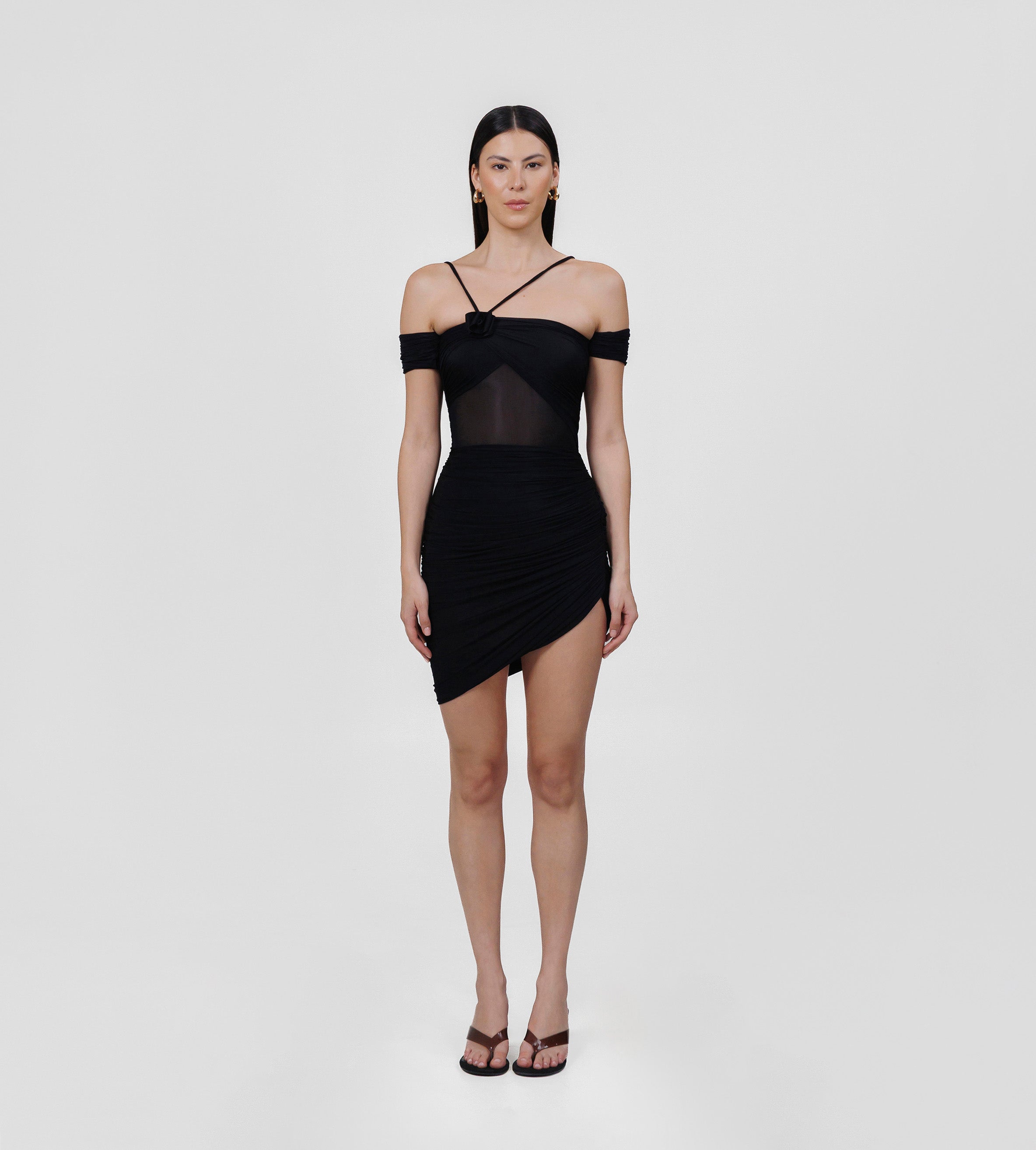 Nuestro vestido mini Moreno presenta un escote de hombros descubiertos con mangas cortas fruncidas y delicadas tiras que se unen en el frente con un adorno floral en 3D. La base asimétrica del vestido juega con capas dobles fruncidas y un panel translúcido en el torso, que fluye hacia una falda cruzada drapeada y da paso a una espalda completamente fruncida, logrando un equilibrio perfecto entre textura y movimiento.