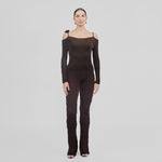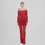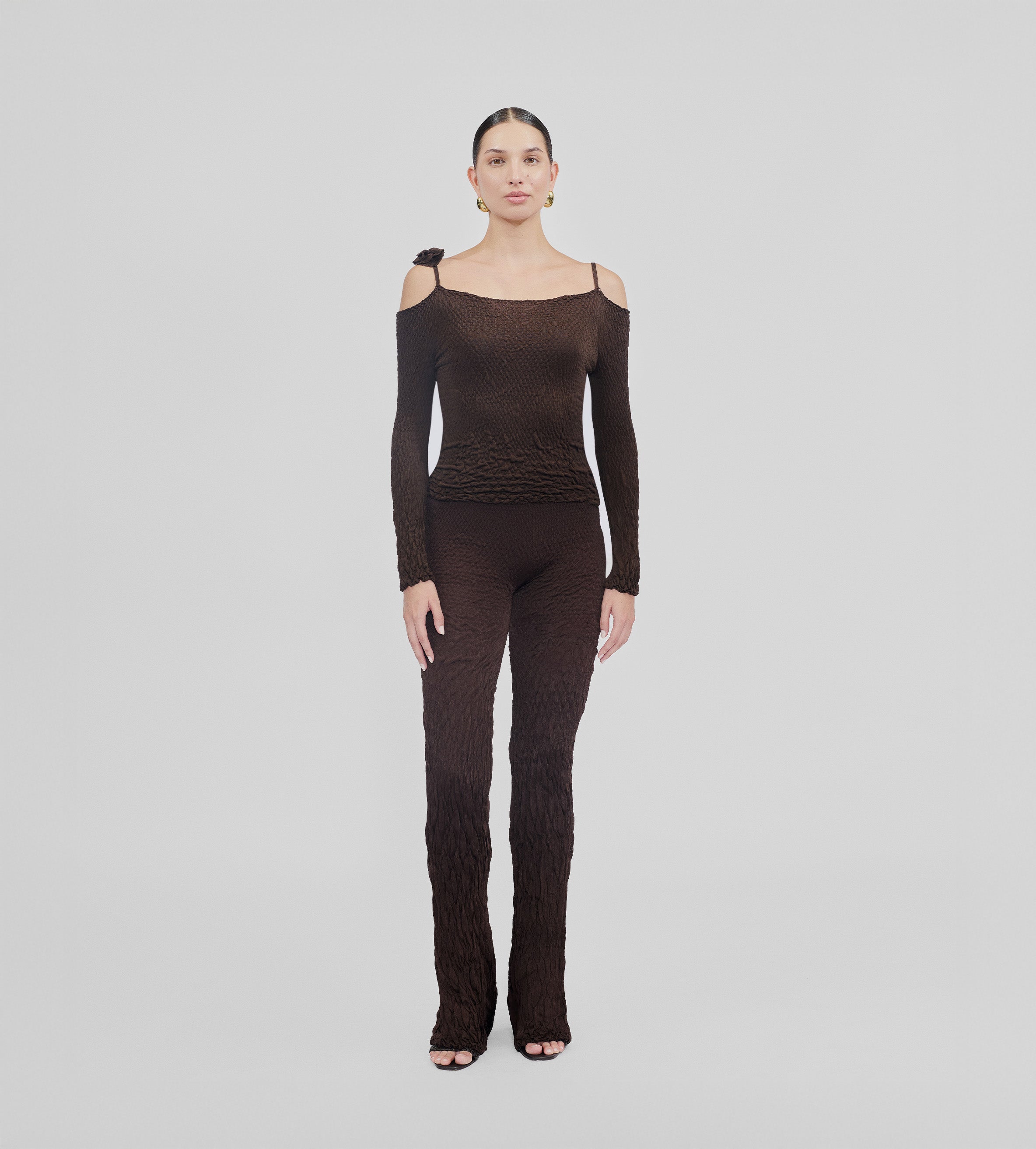 Pantalones acampanados de talle alto y cintura ceñida, confeccionados en nuestro nuevo tejido de punto texturizado que crea un movimiento dinámico y fluido en todo el diseño.