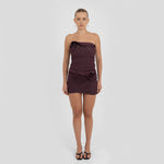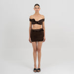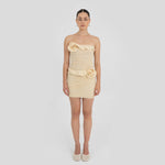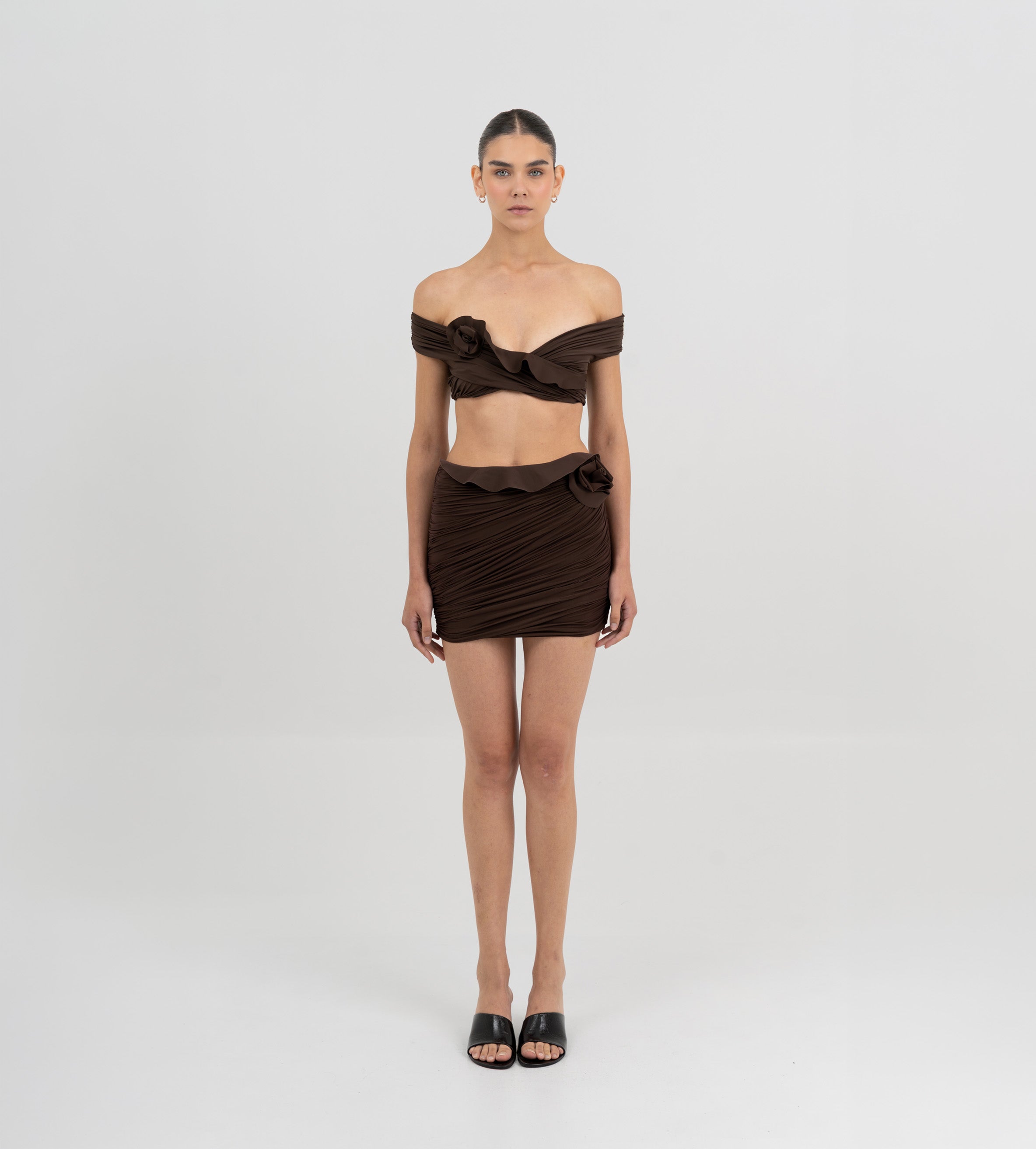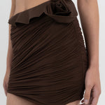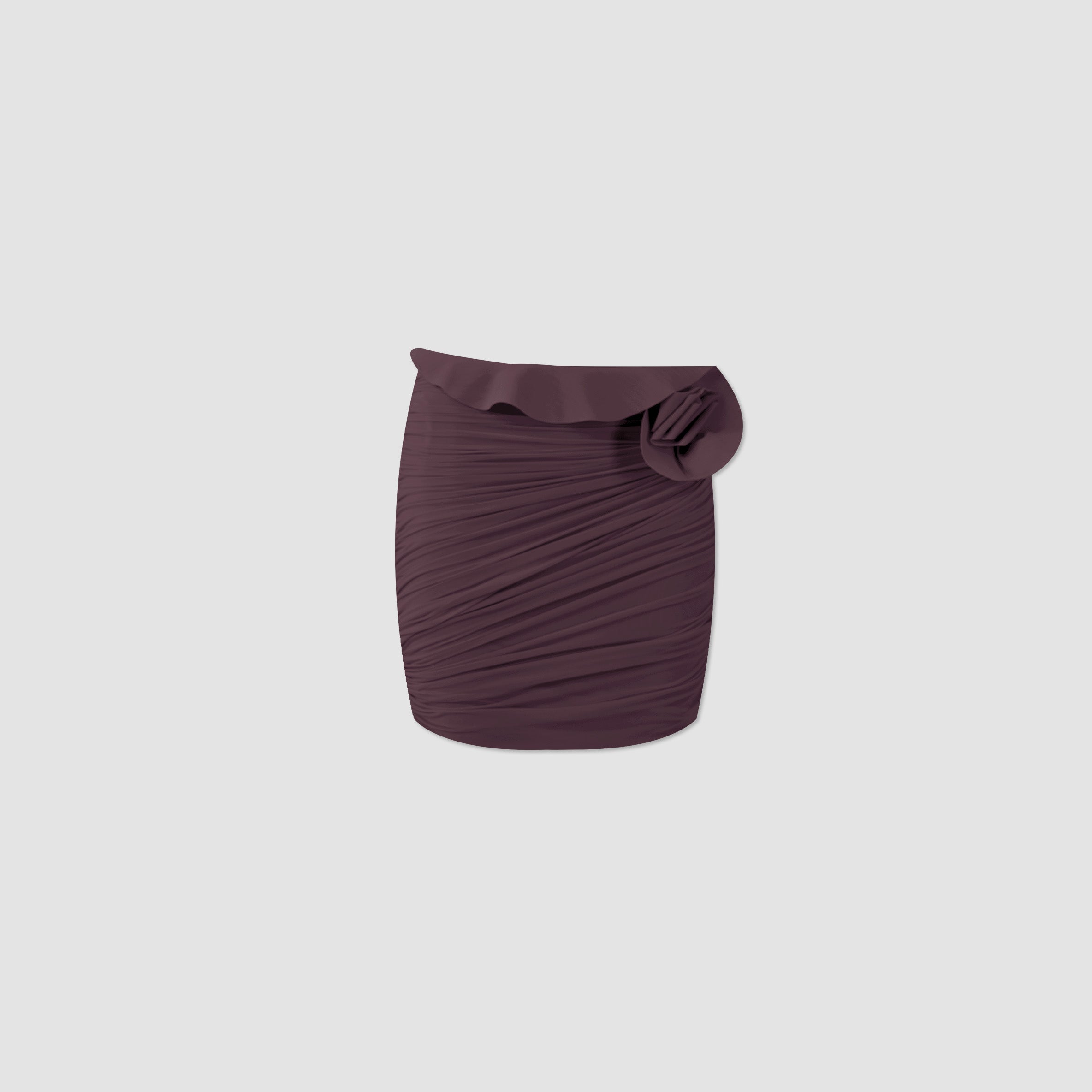Nuestra mini falda Nivaria presenta una silueta de talle alto con suave drapeado que se ve acentuada por un detalle floral en 3D que da paso a una arandela sobre la costura de la cintura en el frente. En la parte posterior un fruncido de doble panel aporta estructura a este diseño escultórico.