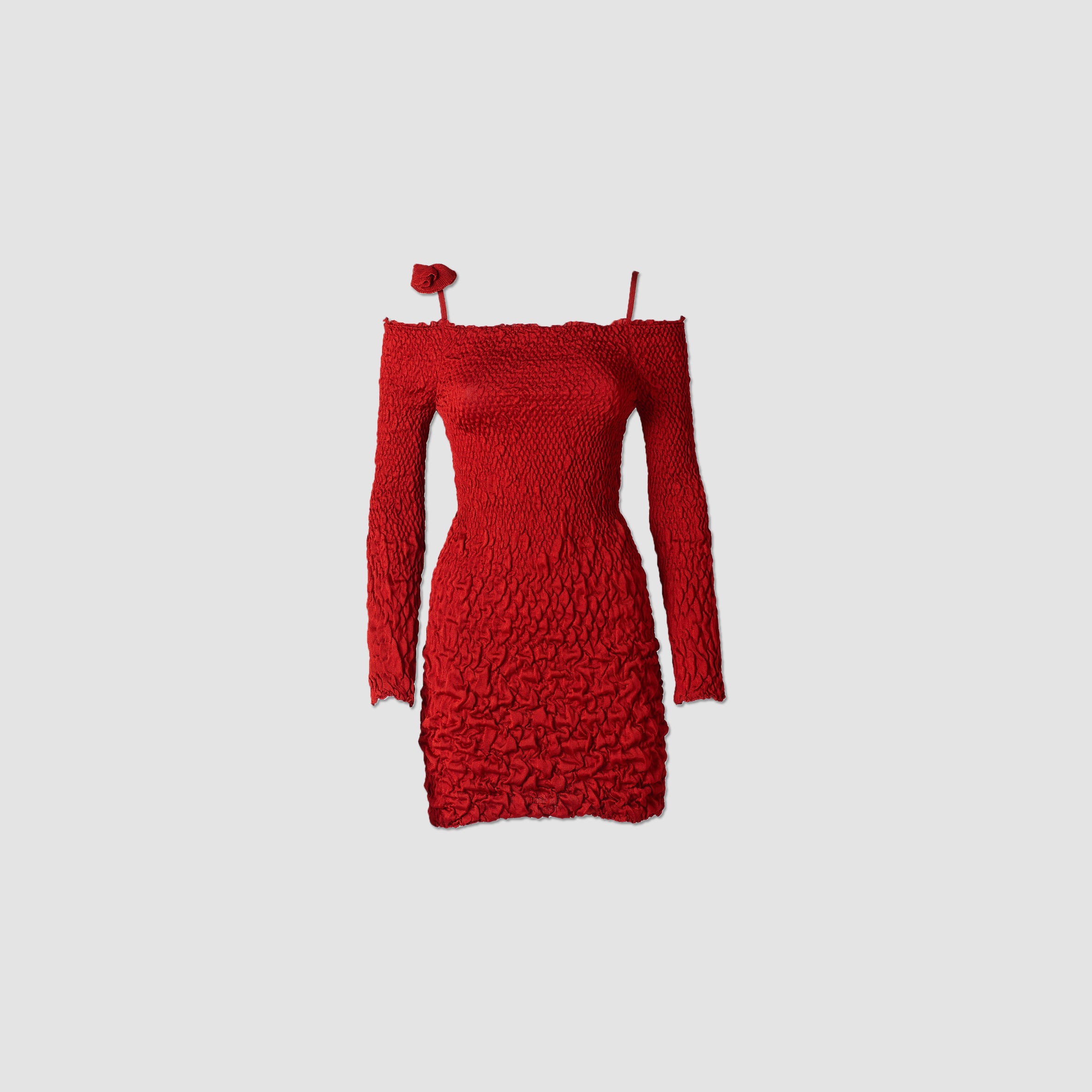 Vestido mini de hombros descubiertos diseñado en nuestra nueva tela de punto texturizada, lleva mangas ajustadas largas, tirantes ajustables delgados que se ven complementados por un detalle de flor 3D hecha a mano en hombro. Este diseño evoca magistralmente la textura de las olas del mar, mientras captura la magia inspirada por su esencia cambiante.