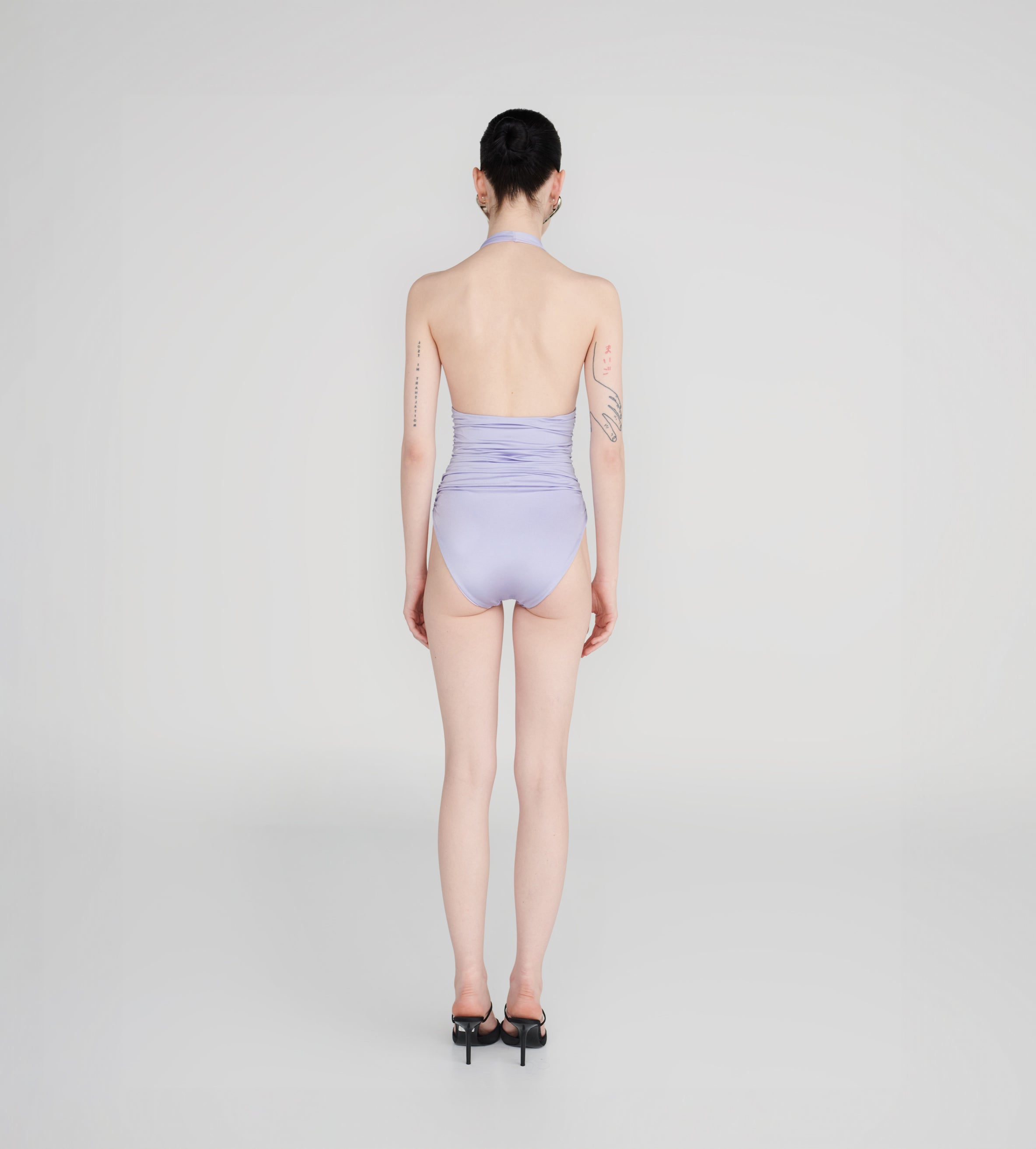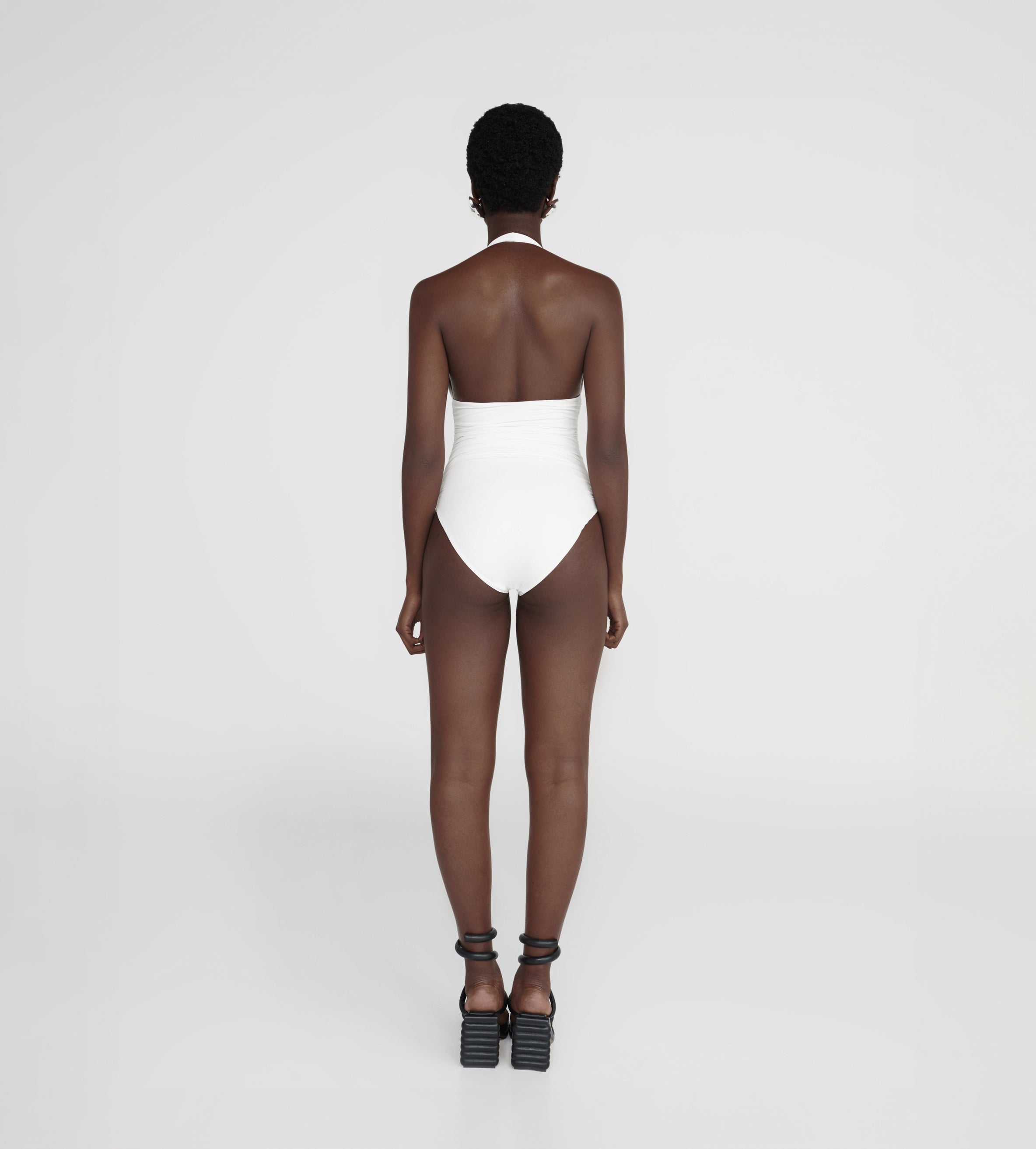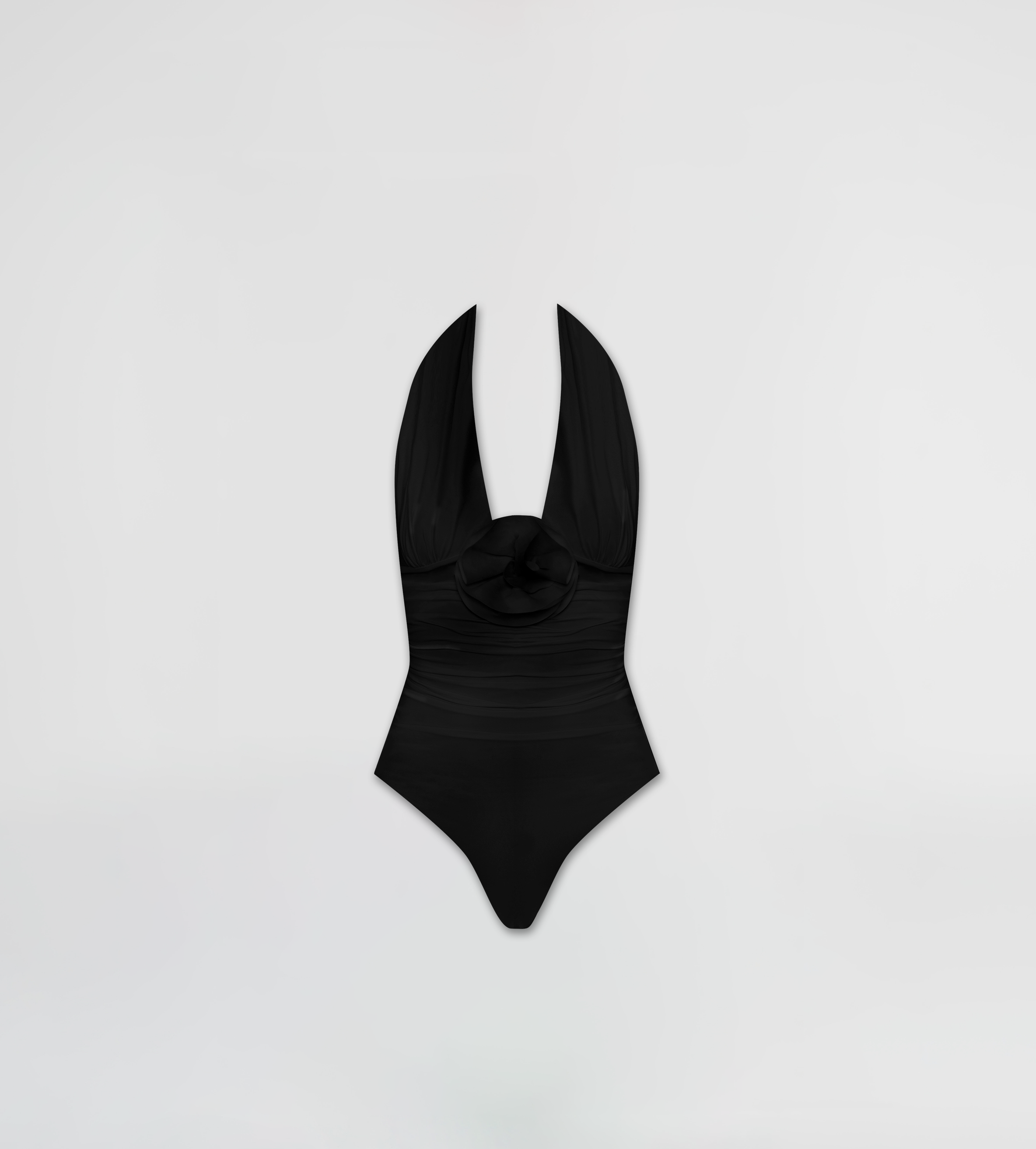 Traje de baño de una pieza, con escote profundo tipo halter y espalda descubierta, lleva un detalle de fruncidos sobre el cuerpo, los cuales abrazan las curvas de cada mujer; decorado con un detalle floral hecho a mano que representa la esencia dinámica y siempre cambiante de la mujer latina.