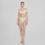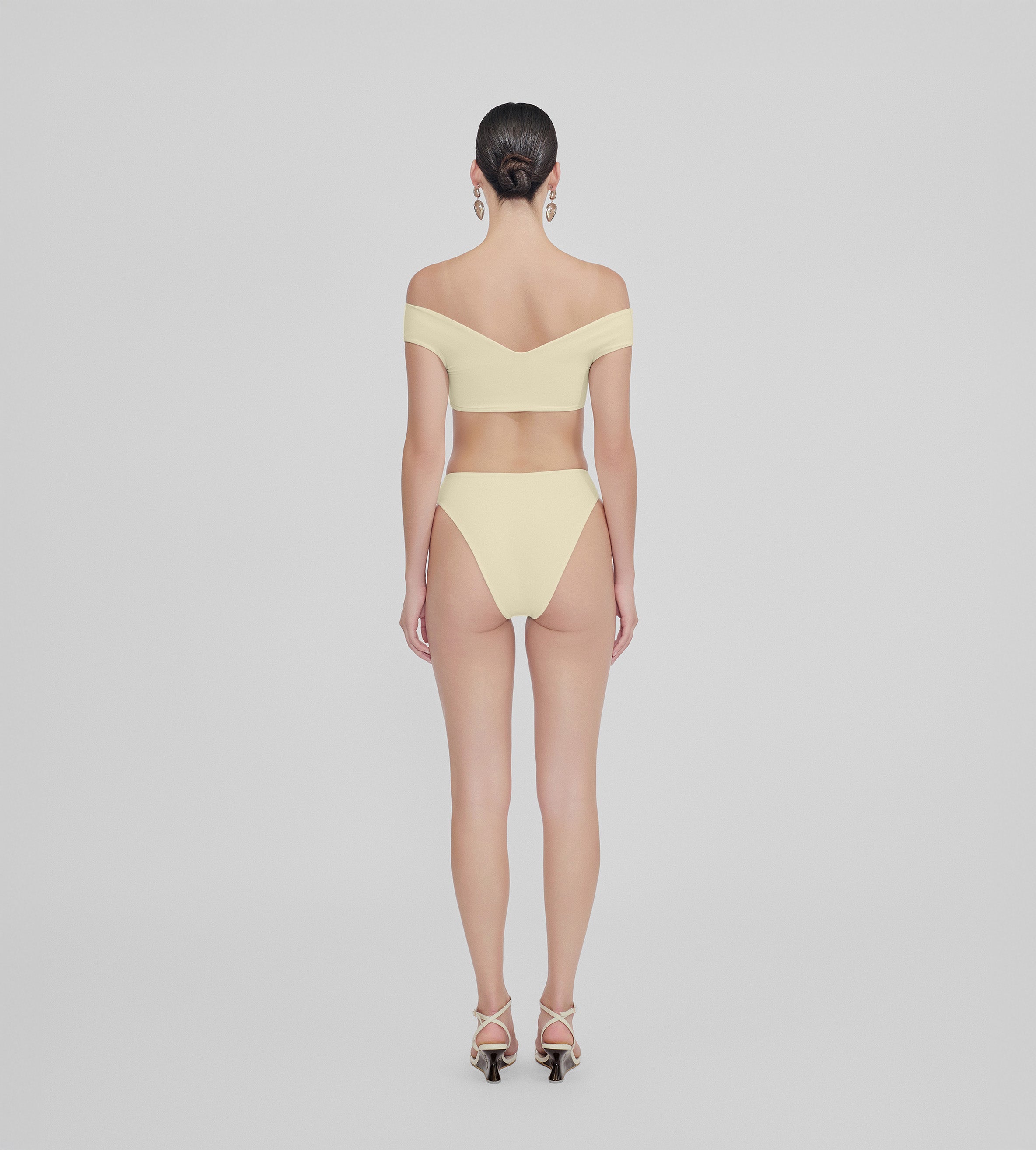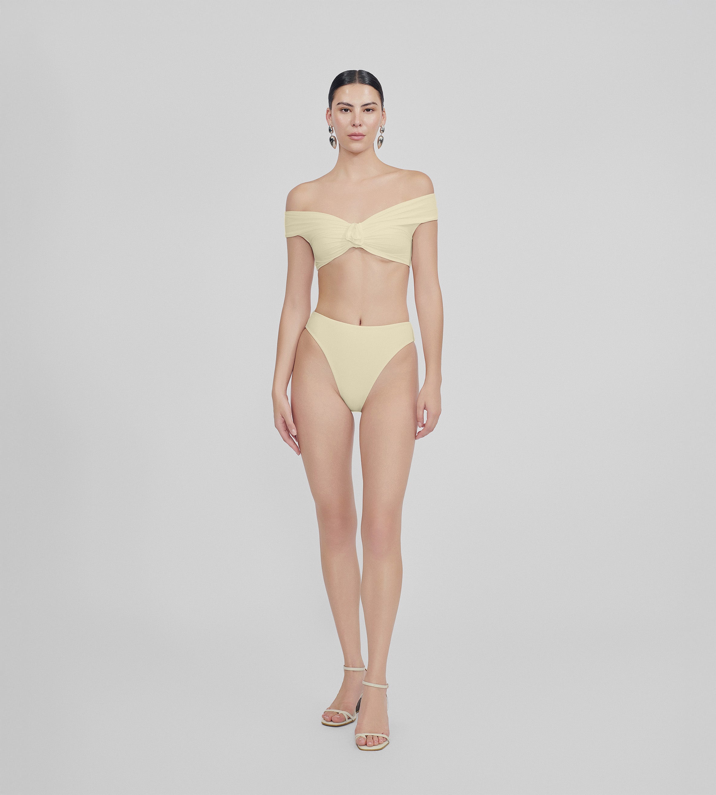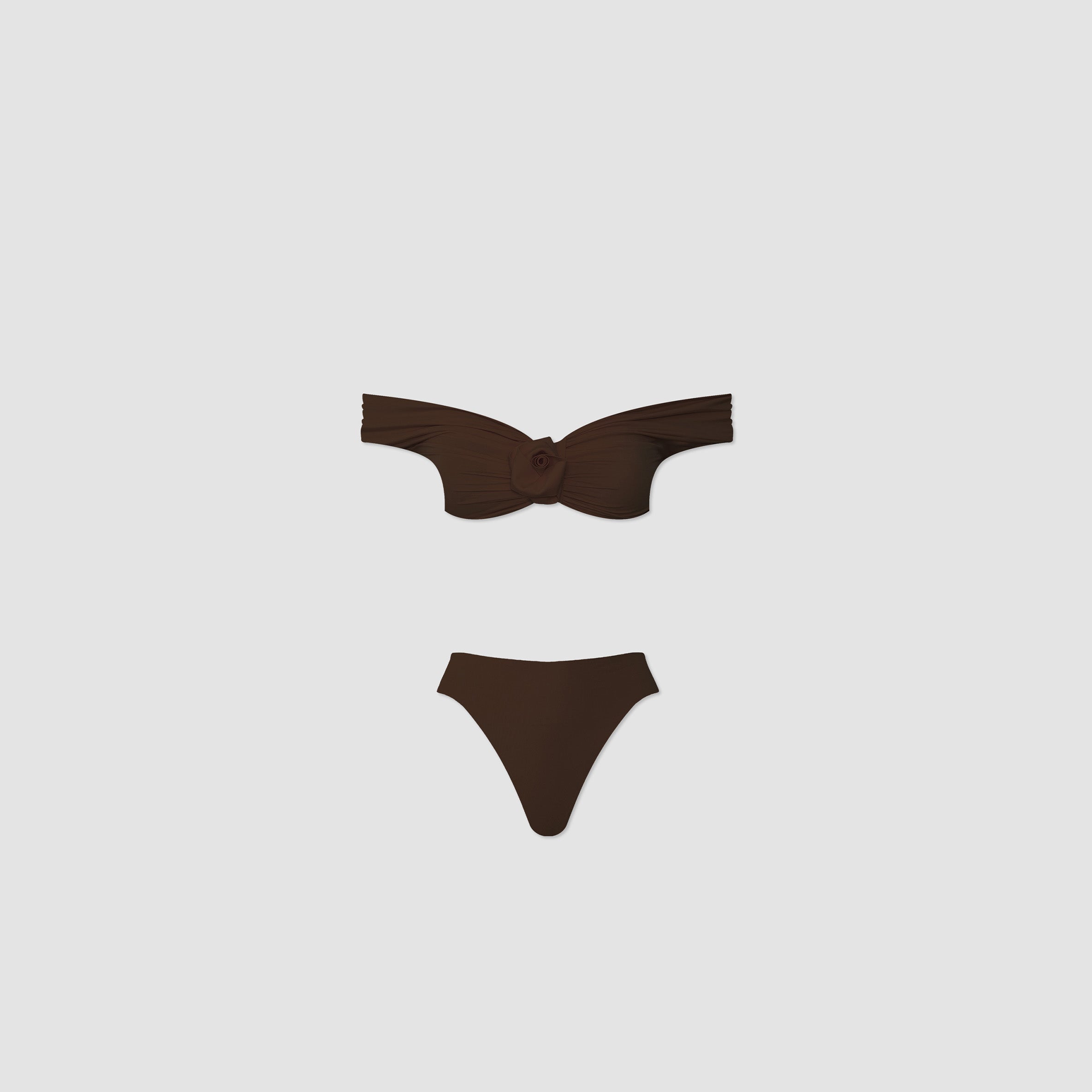 Nuestro traje de baño de dos piezas, Sauco, presenta una interpretación moderna de una silueta vintage. Con un top de escote en forma de corazón y hombros descubiertos, con fruncidos en los laterales de los brazos y un detalle floral central en 3D. Se acompaña de una parte inferior de tiro alto y pierna profunda.