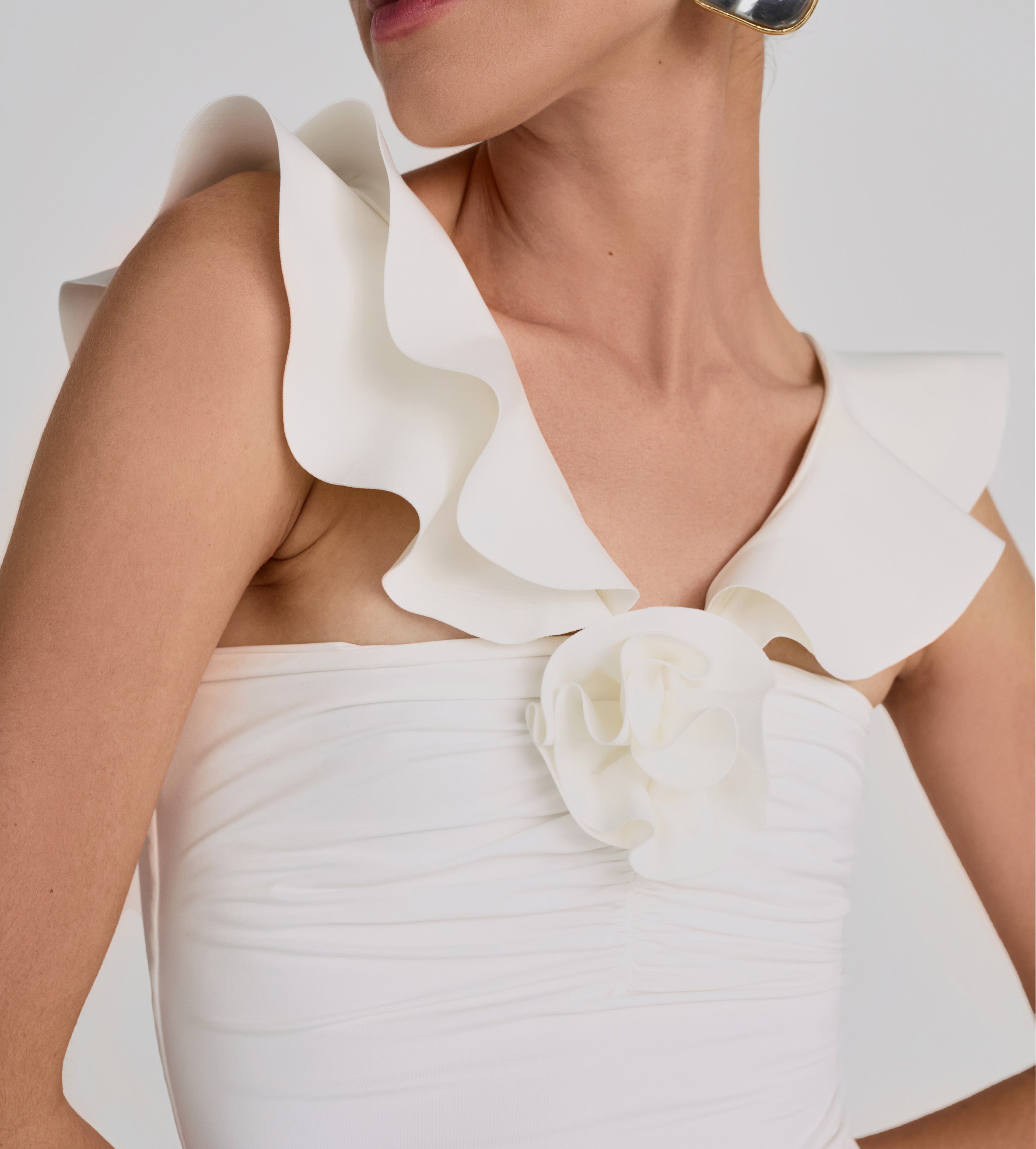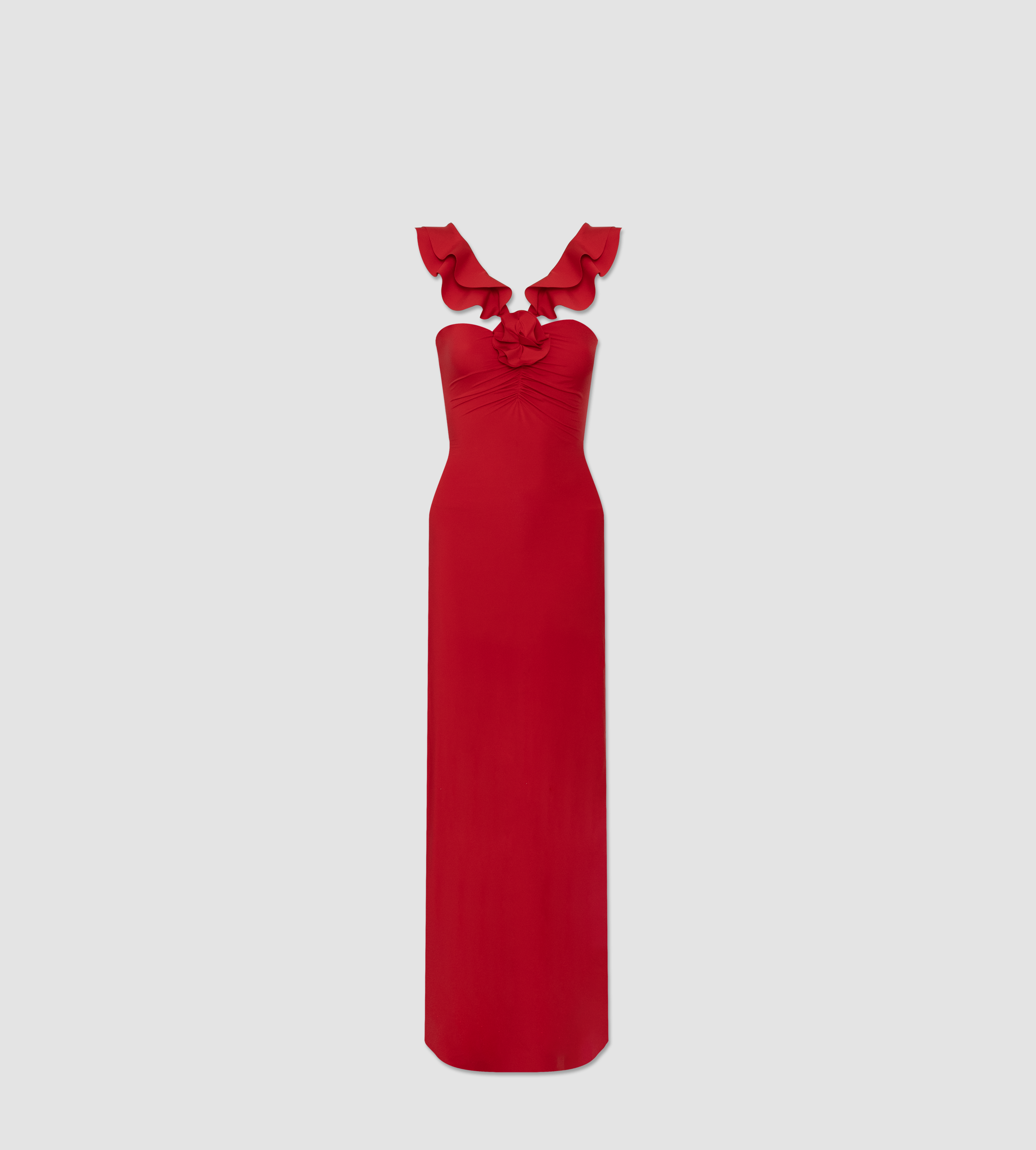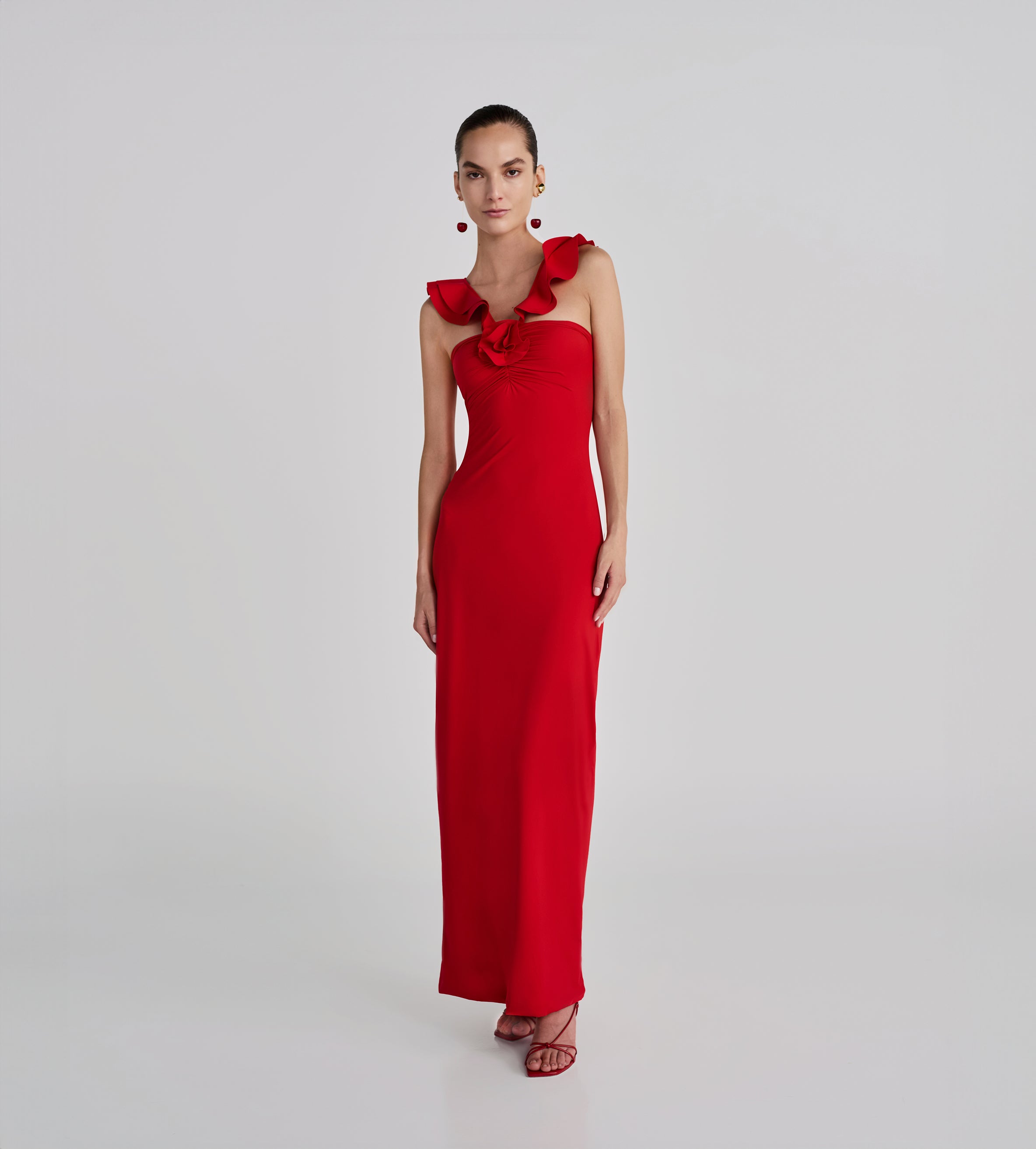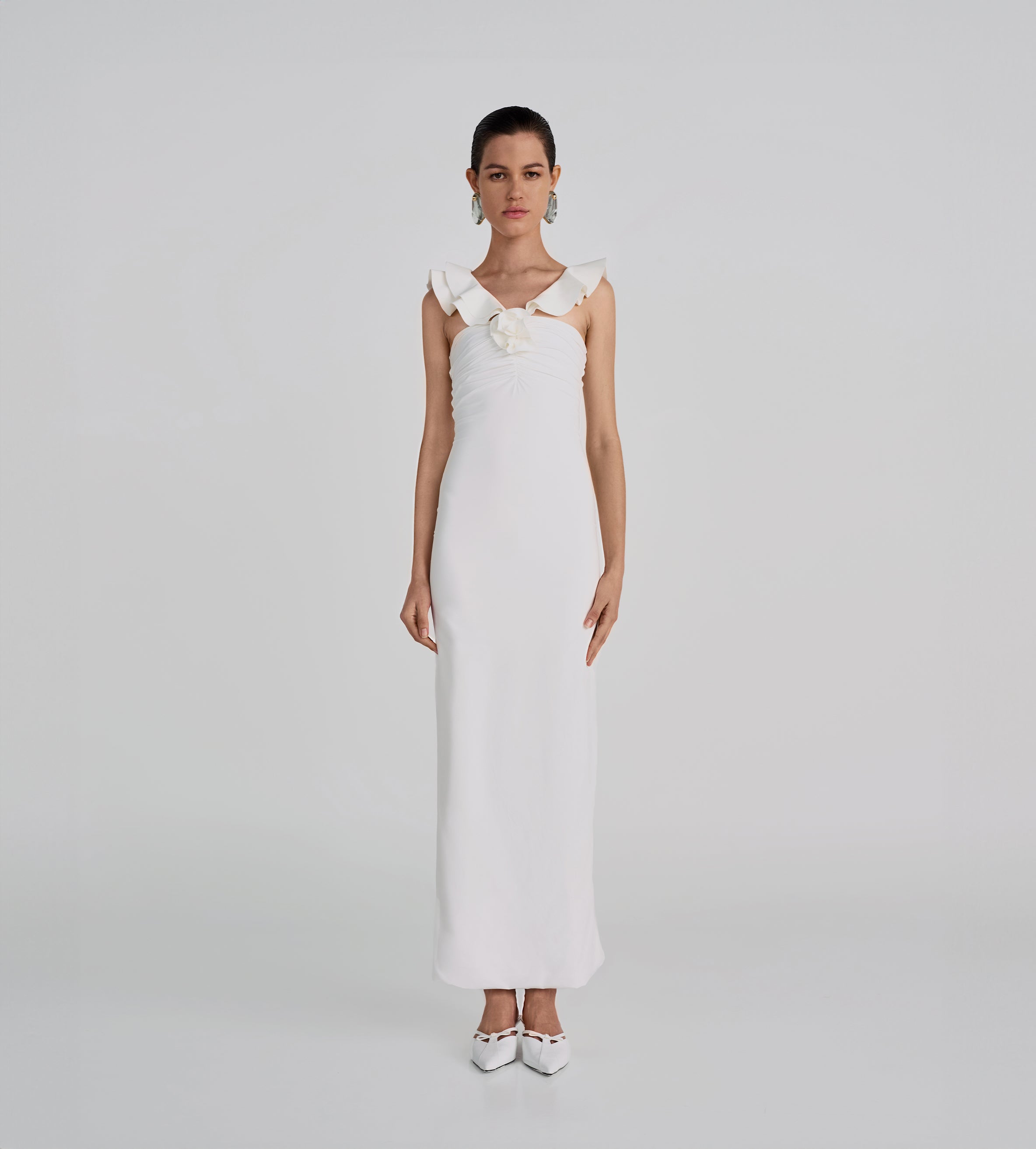 Vestido largo ajustado con escote semi-corazón y tiras dobles de volantes multifuncionales, ofreciendo versatilidad de estilos. Terminado con detalles fruncidos en el delantero y adornado con flor 3D hecha a mano, una colección de detalles que representan la esencia de nuestra marca.
