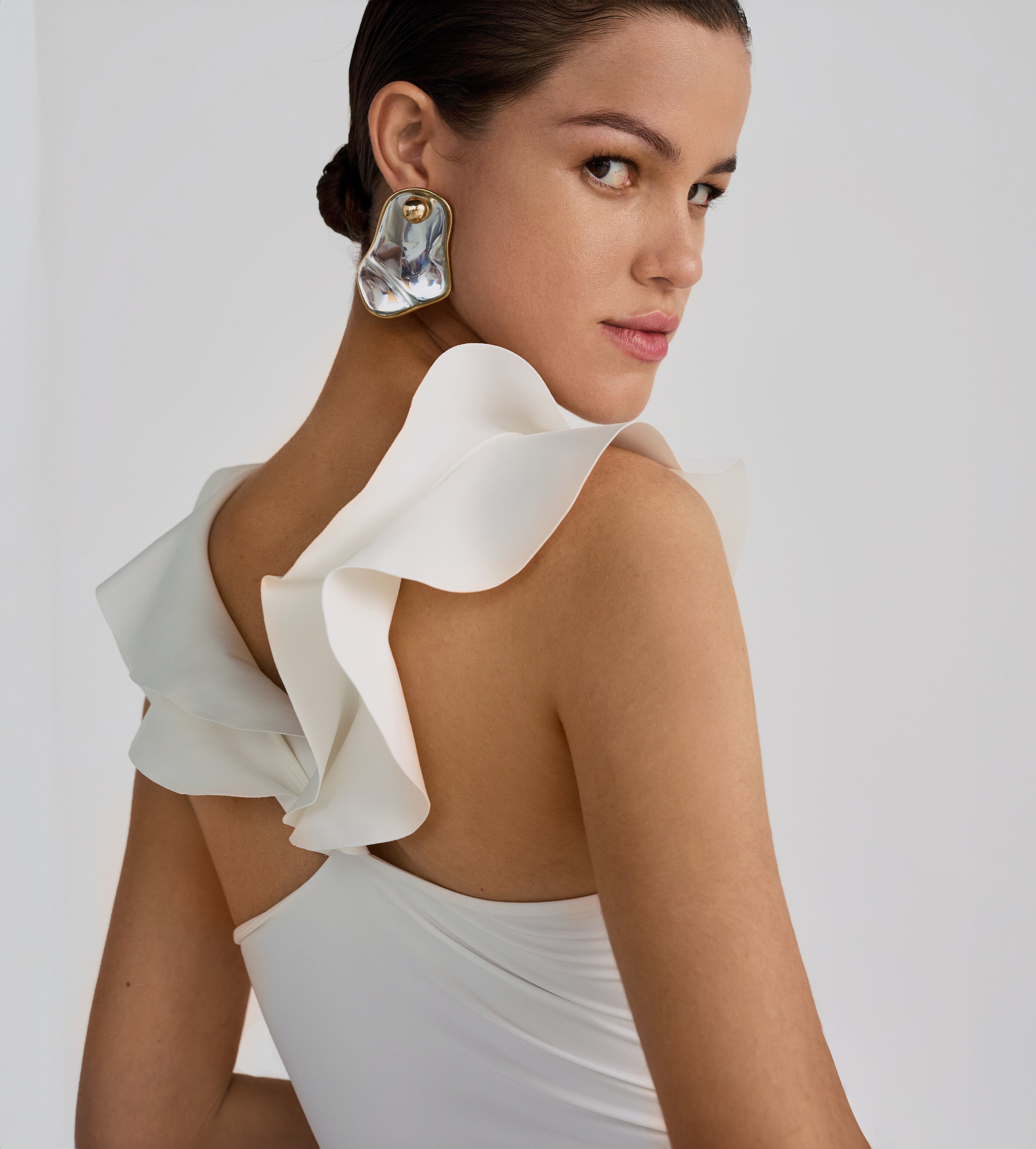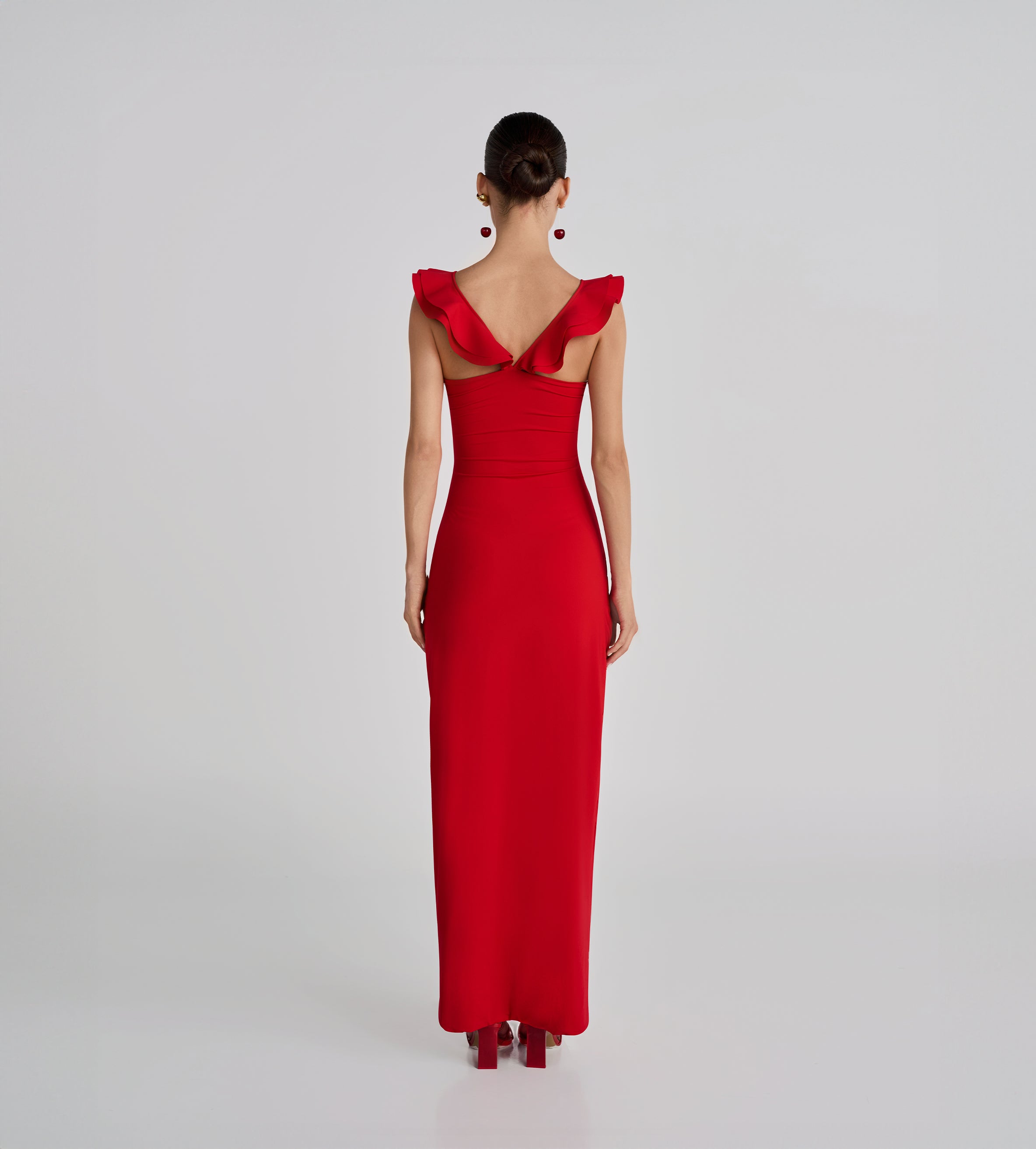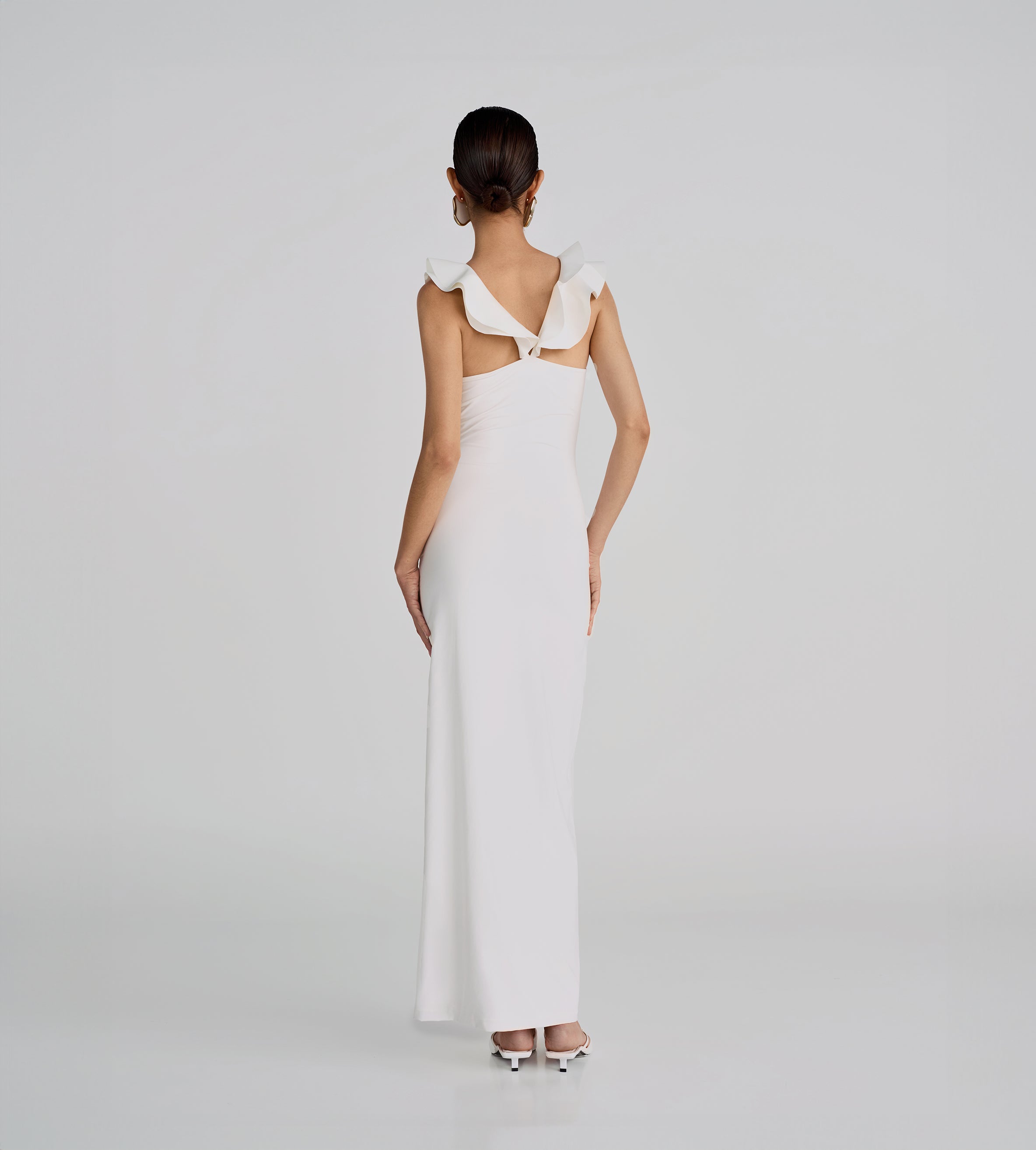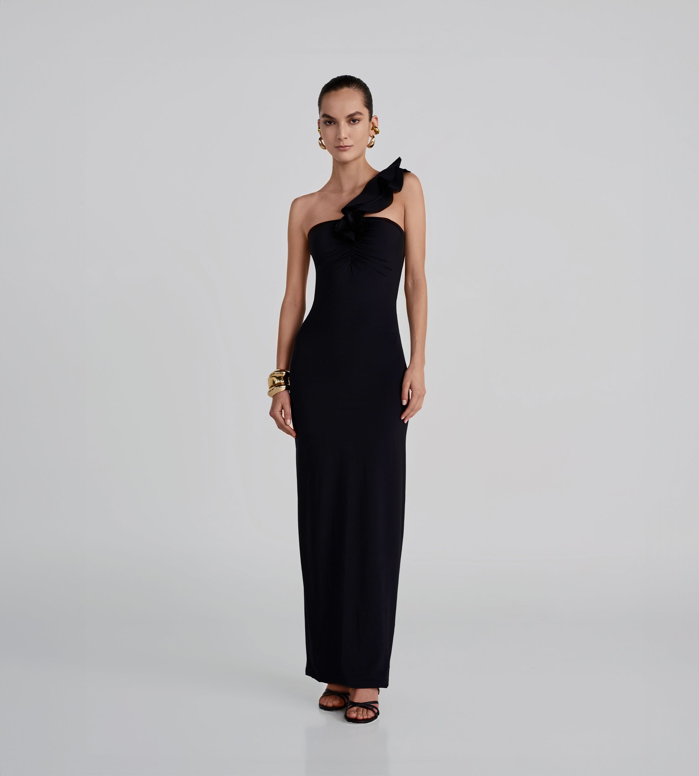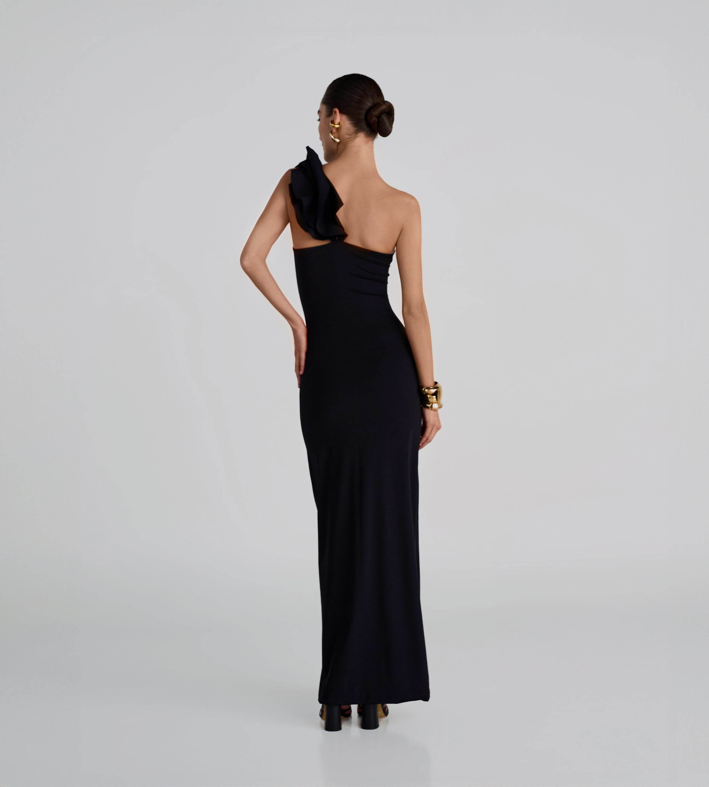 Vestido largo ajustado con escote semi-corazón y tiras dobles de volantes multifuncionales, ofreciendo versatilidad de estilos. Terminado con detalles fruncidos en el delantero y adornado con flor 3D hecha a mano, una colección de detalles que representan la esencia de nuestra marca.