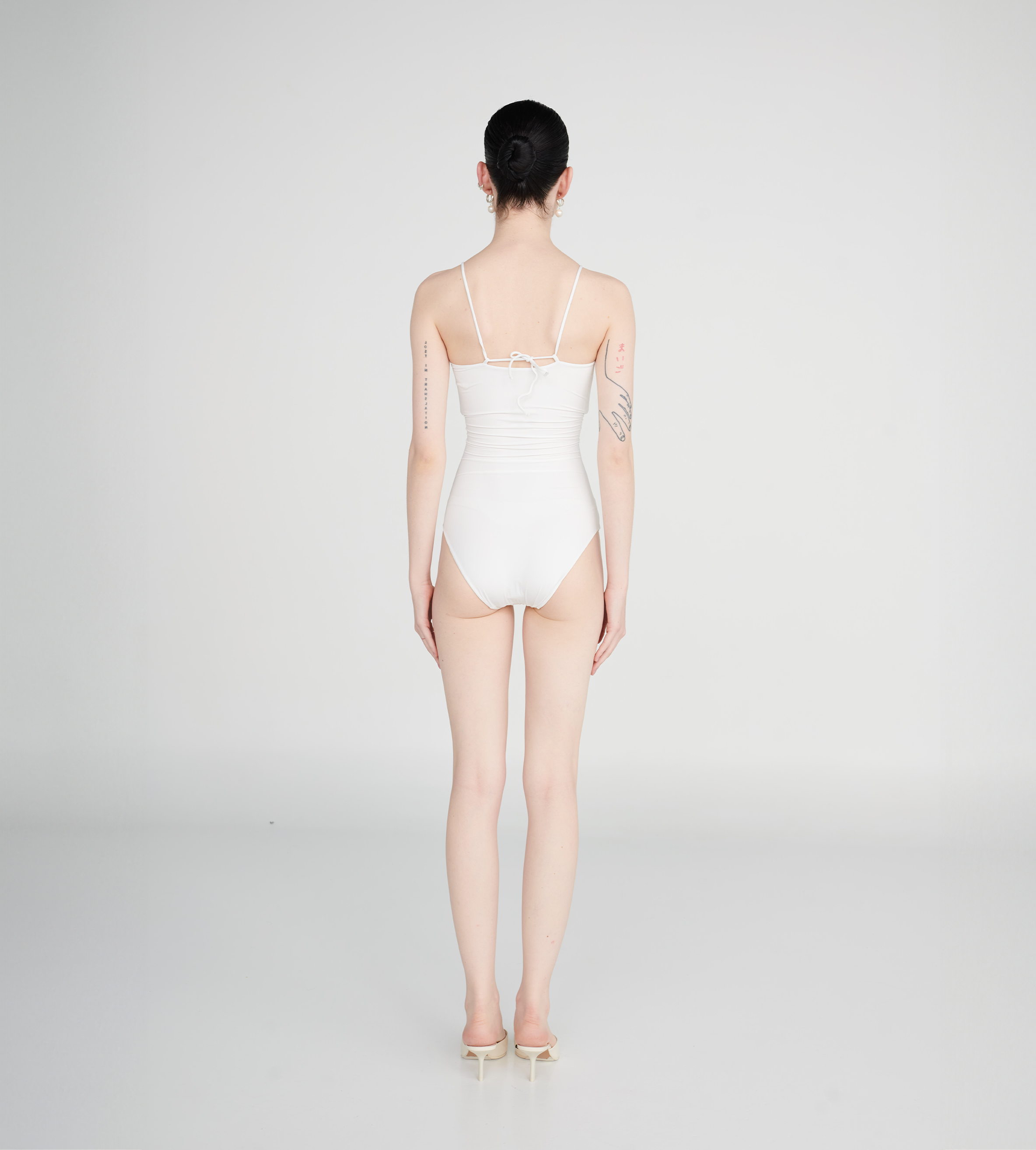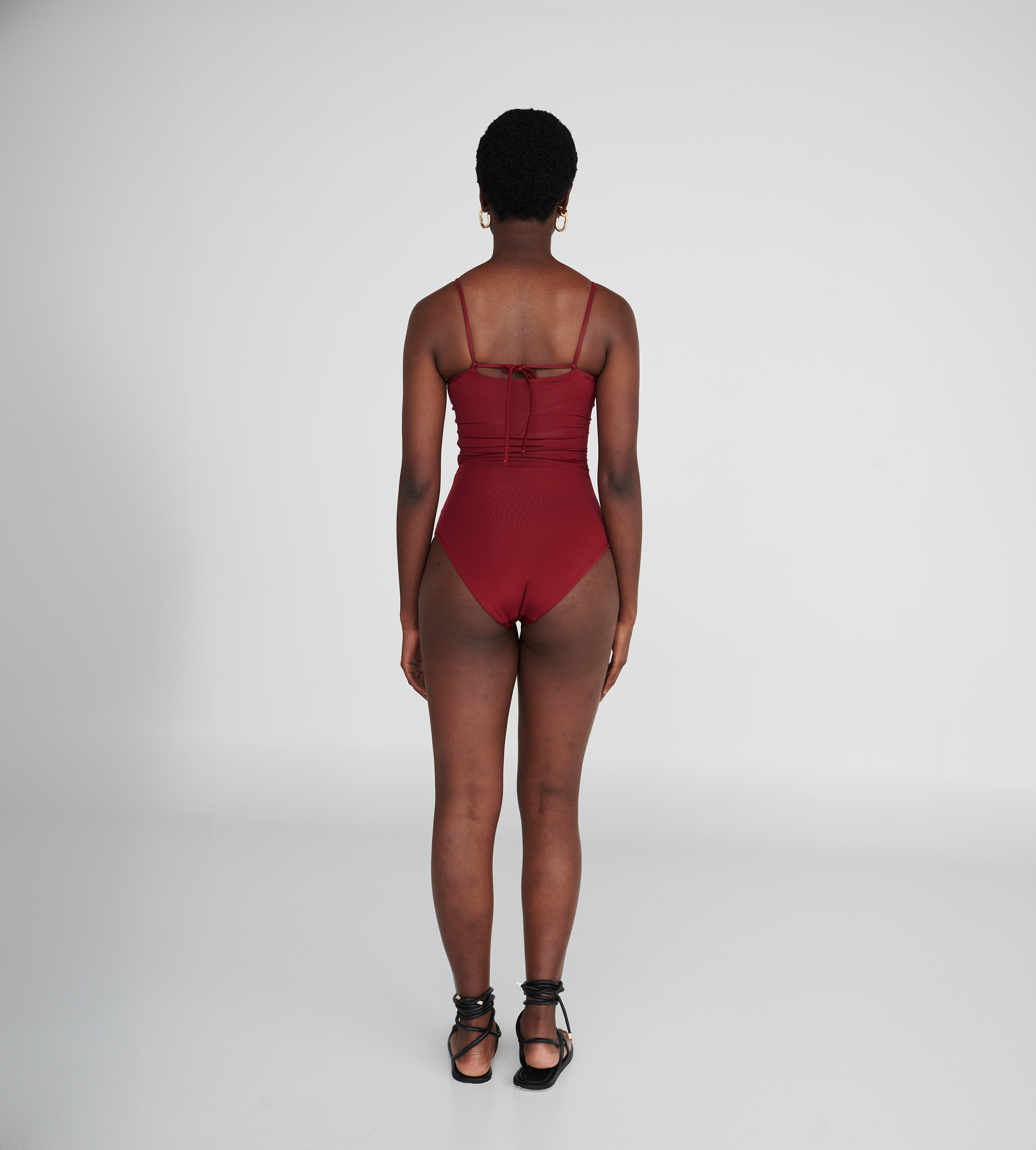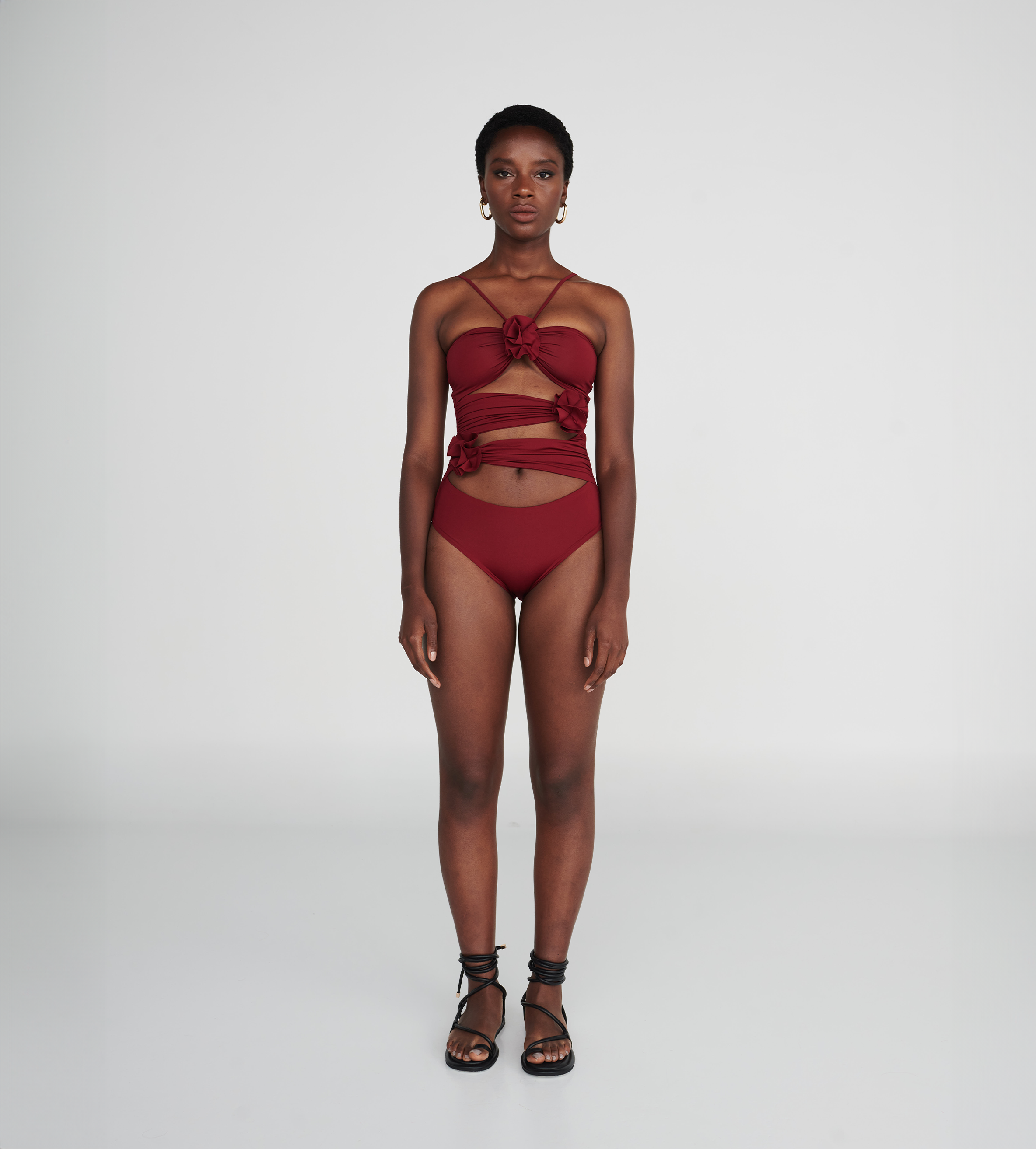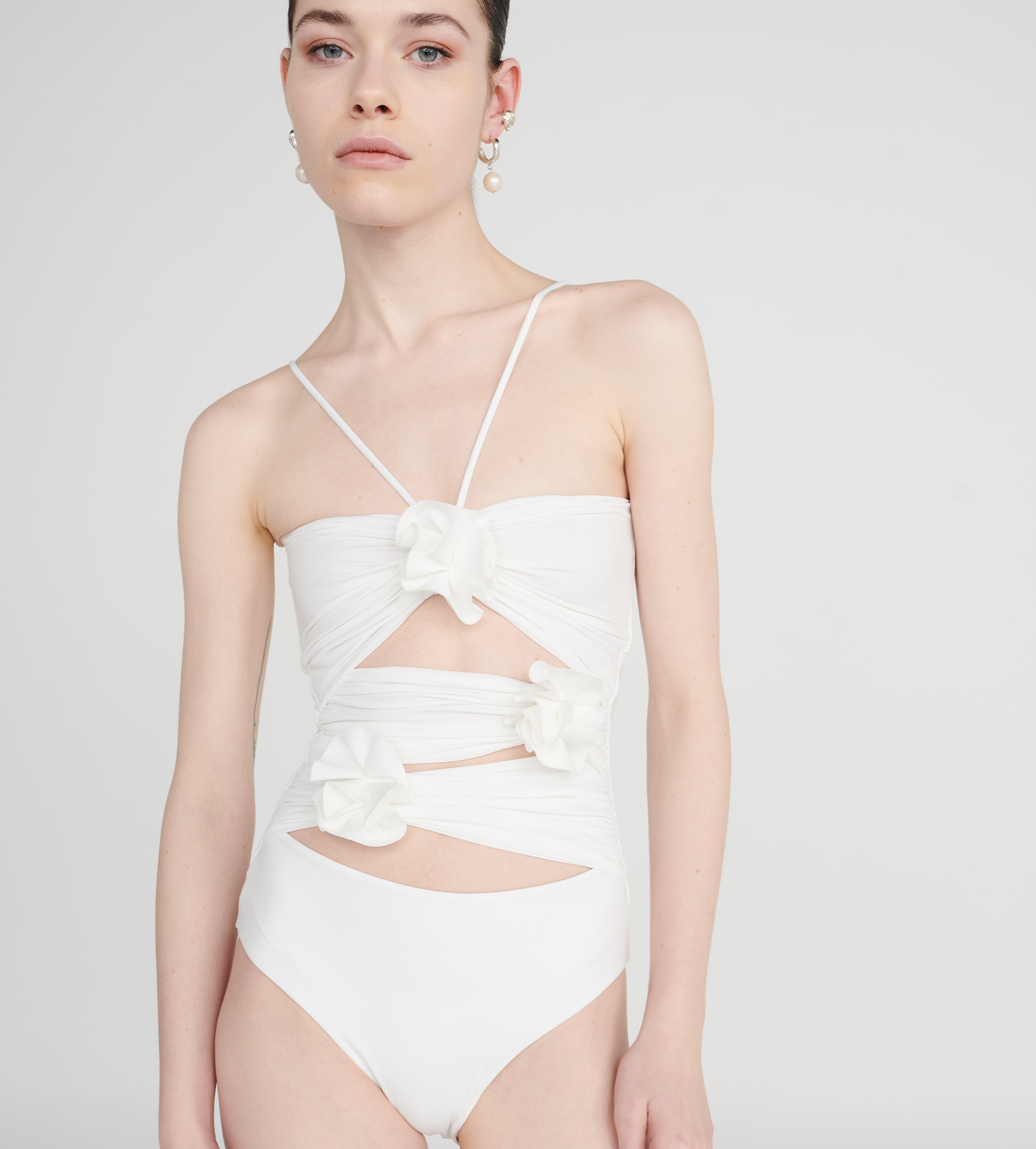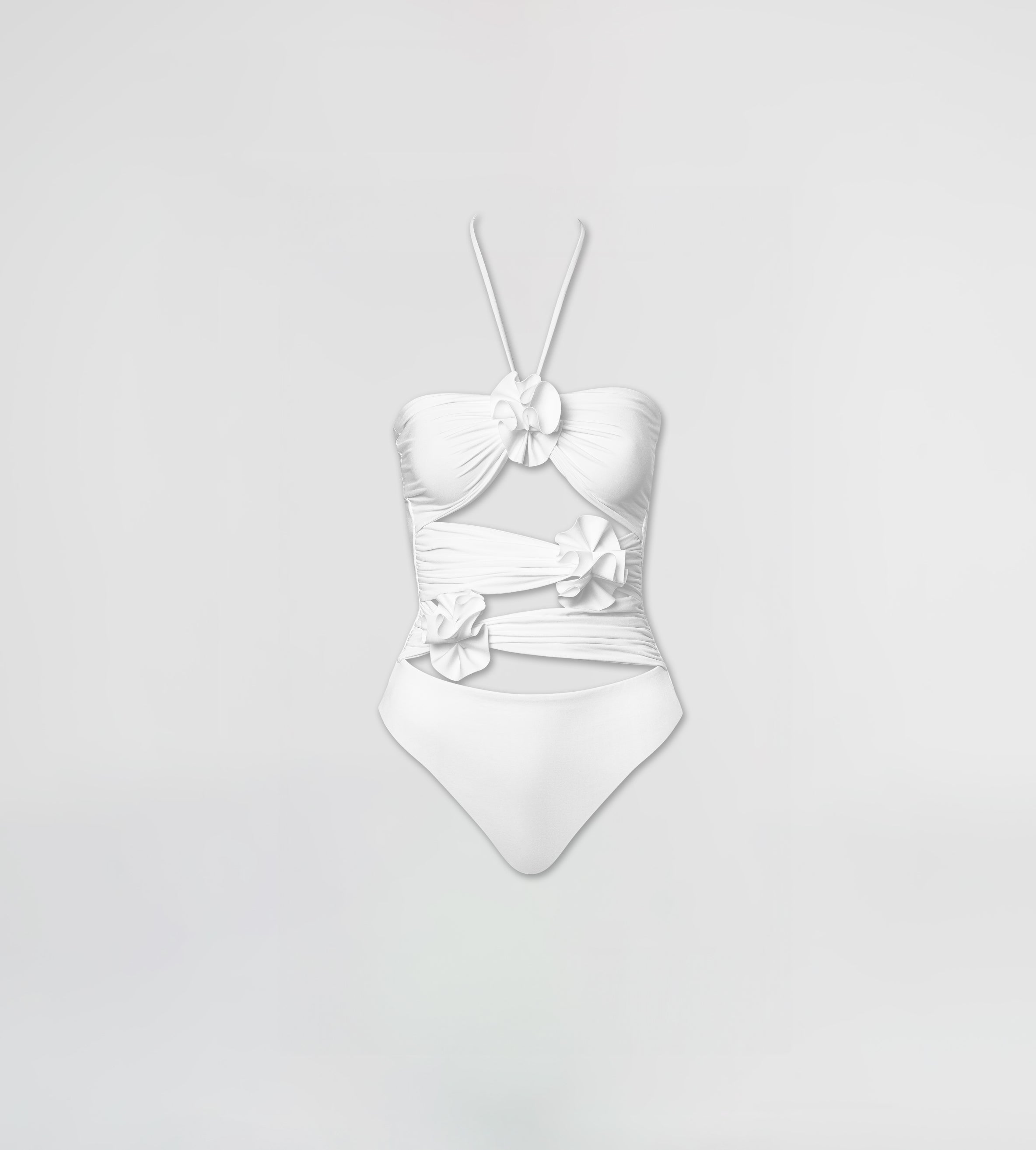 Traje de baño de una pieza con escote recto en la parte delantera y trasera, cierre de nudo y aberturas asimetricas en el abdomen con 3 flores de arandelas. Este traje tiene un corte de pierna más alto que estiliza la figura.