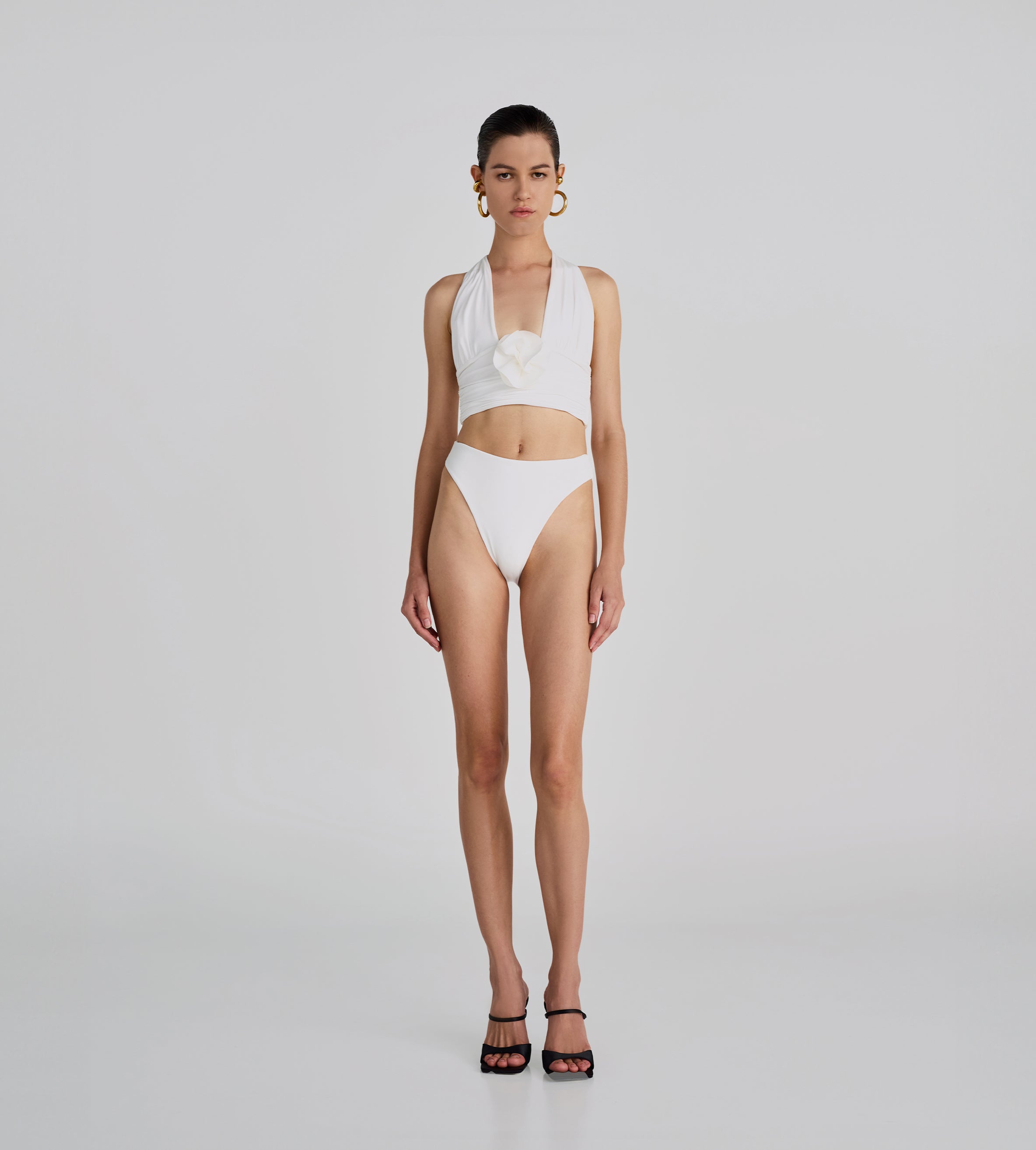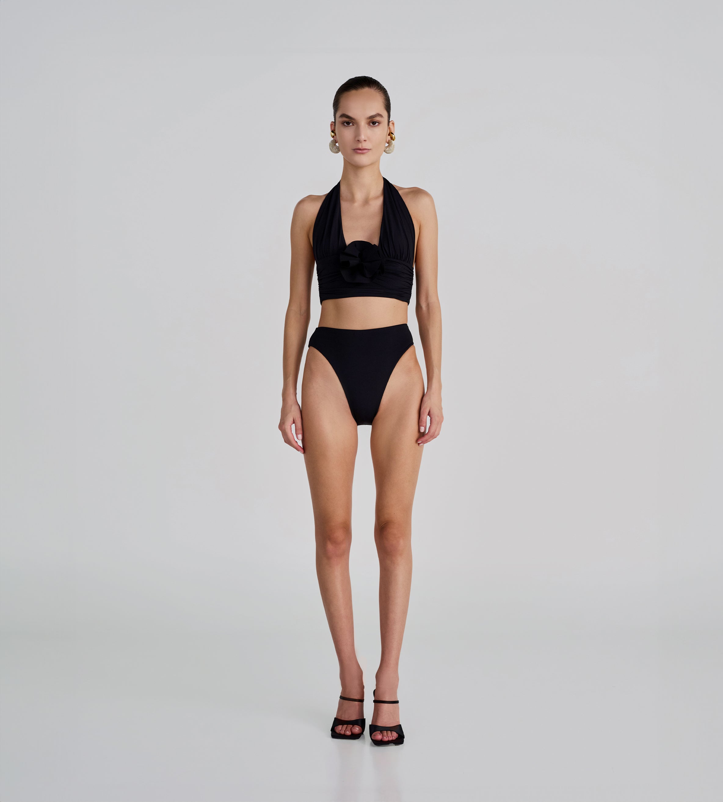 Nuestro traje de baño de dos piezas Vives presenta un top de escote tipo halter, con una amplia tira fruncida que abraza perfectamente el cuerpo y adornado con un detalle de flor 3D hecha a mano en el delantero; junto con una parte inferior de talle alto y cobertura media, una combinación femenina y coqueta para los días de verano.